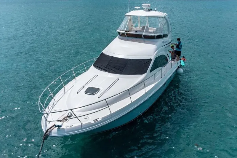 Sliding glass doors open to the ample COCKPIT and oversized integral SWIM STEP, with SIDE DECKS to access the FOREDECK for sunning, plus molded stair access to the FLYING BRIDE DECK above.