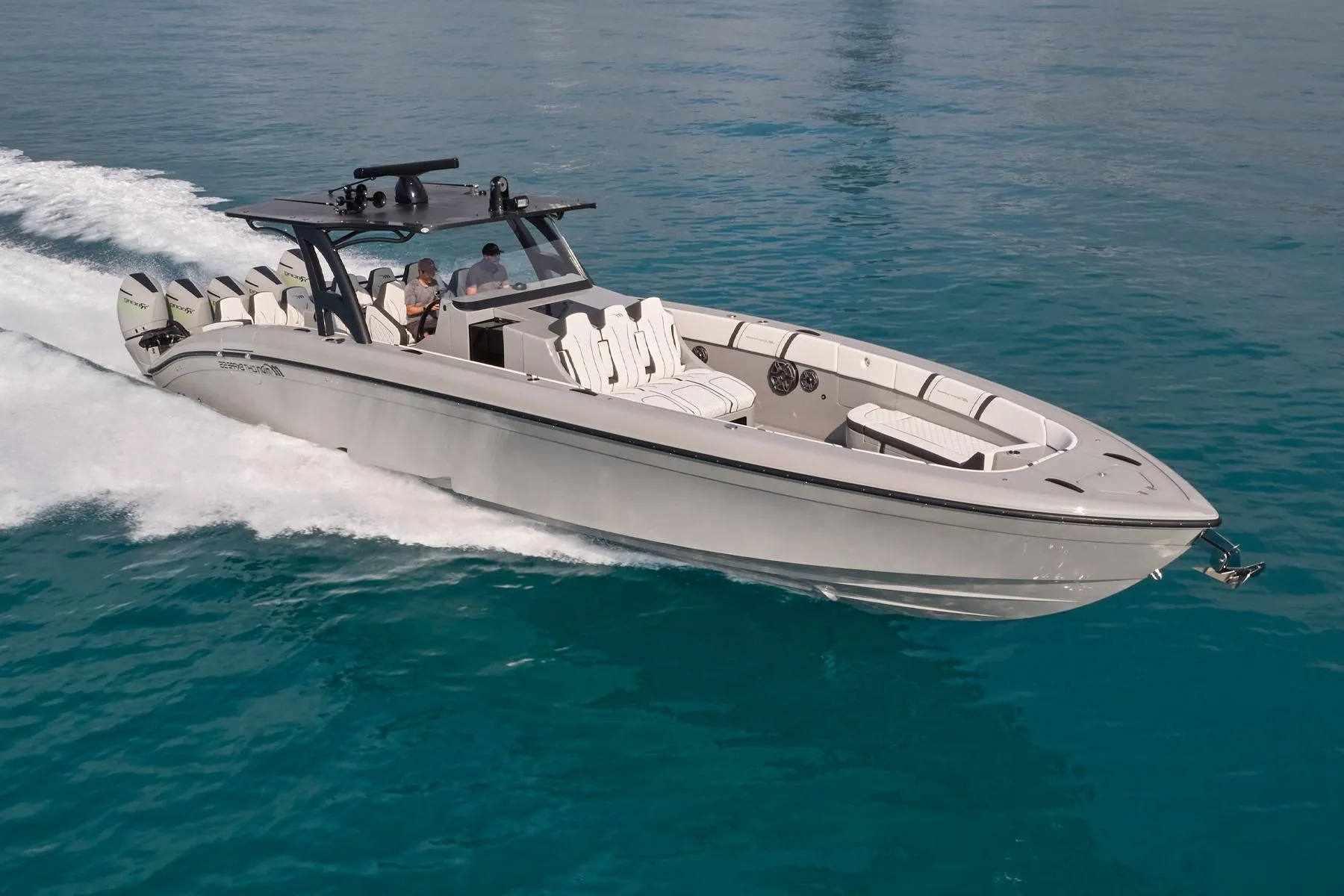 GHOST is the perfect fusion of speed, luxury, and cutting-edge design, setting a new standard for modern center consoles. Built for performance and style, this stunning vessel features a spacious, thoughtfully designed-layout. The aft area boasts a custom lounging space in place of live wells, complemented by the signature wide T-top for ample shade. The open cockpit offers plenty of room for relaxation, while the versatile seating includes an aft U-lounge with storage, a forward fiberglass U-seat with an electric table that transforms into a sunpad, and an upgraded helm with an adjustable electric front seat.