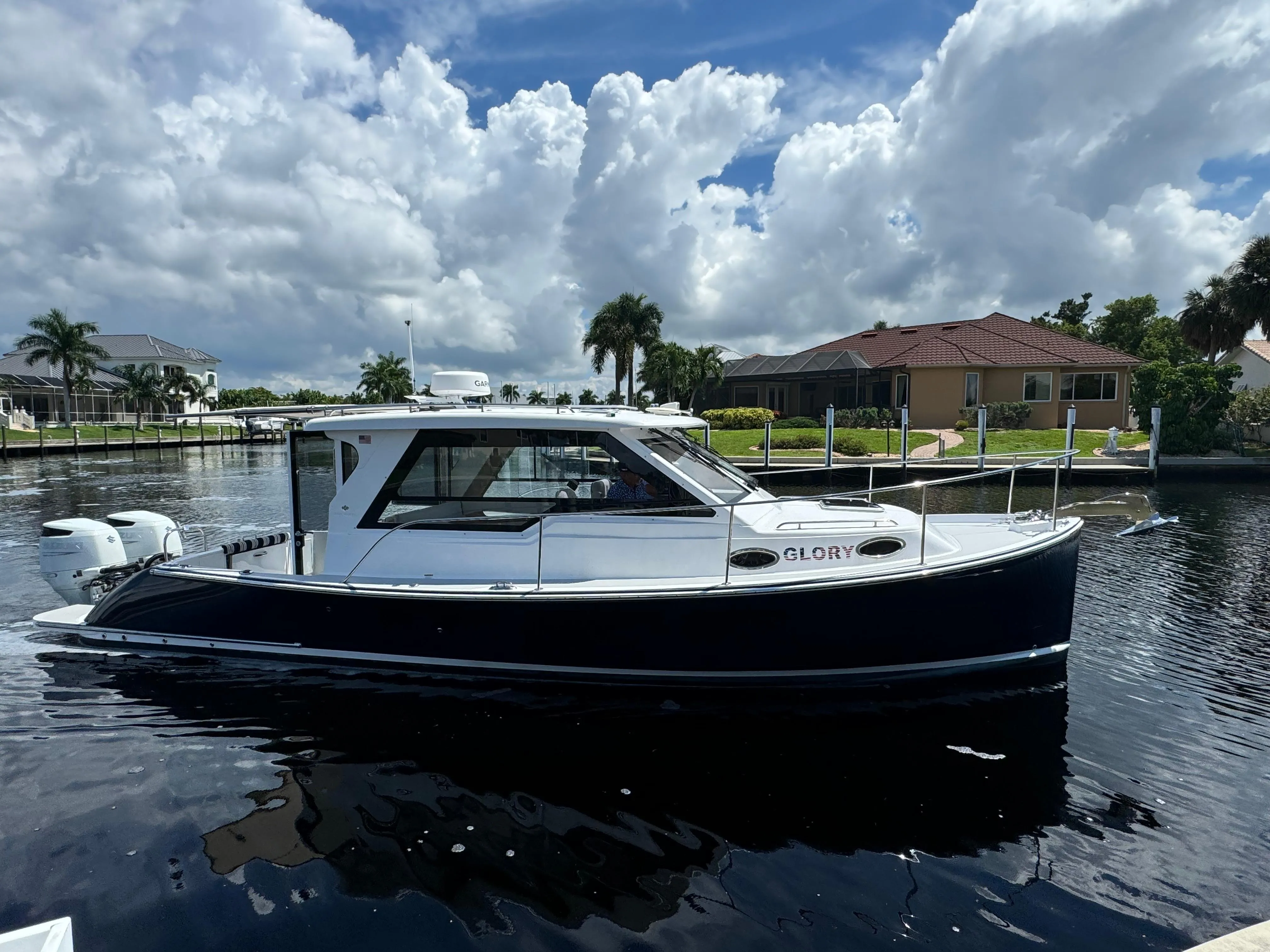 "Glory" is a 2023 True North 34 OE (Outboard Express) owned since new, and has been kept on a lift at the owner's home. It has a Flag Blue hull, TWIN 300HP SUZUKI engines with under 100 hours, engine warranties till 2027, Joystick with Position and Heading Hold Feature, a PAGURO 4KW generator, two VELAIR A/C units with heat, a bow thruster, and full electronics. The current owners have enjoyed "Glory" but are moving up.