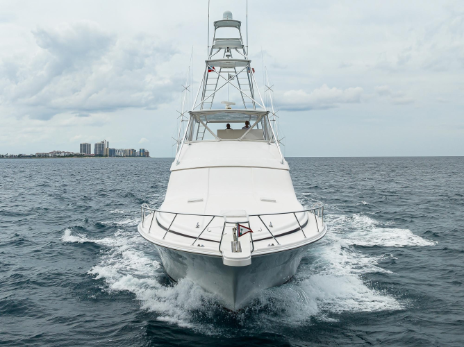 The 70 is a warrior in all types of weather conditions. The deep-V hull, which set the standard for offshore excellence more than 60 years ago, allows performance and comfort at cruise. Goin Deep cruises at 35 knots. Her solid fiberglass hull bottom and high-density foam construction hull sides are proven. Her MTU 16V-2000s are low hour at 2,000 and have had the 2,000 service.