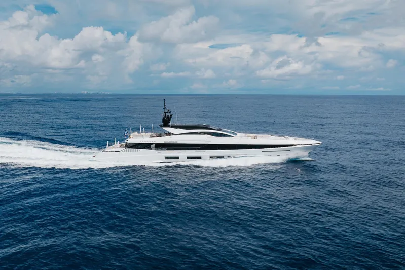 GOLDENEYE features a beam of 8.9 meters, a draught of 2.33 meters, and an interior volume of 497 GT. She accommodates up to 12 guests and provides quarters for 9 crew members, including the captain. Powered by four MTU engines, she reaches a top speed of 29 knots and carries 71,000 liters of fuel on board.