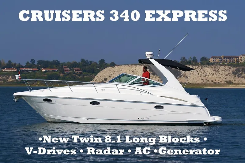 The Cruisers 340 Express offers unbeatable performance in an expertly designed, luxurious cruising package. Her interior accommodations will sleep five comfortably. The forward stateroom features a large double bed with easy access, and the stateroom can be closed off from the salon by a privacy curtain or an optional bulkhead and door. Aft, owners can select either a fixed double berth, maximizing overnight accommodations for guests, or an alternate layout with a circular settee that can also be converted to a double berth. With the settee layout, this area can effectively lengthen the salon into one wide open living space or, with the privacy curtain, it can serve as a comfortable mid cabin. The facing dinette - or available crescent-shaped, convertible dinette - to starboard provides an additional berth. Located just to port of the companionway is a full-service galley with all the amenities, including a large refrigerator/freezer, microwave and double-burner electric stove. For additional on board convenience while cruising or living aboard, the 340 also provides a feature unusual for a boat in this class: a spacious head with a large, separate shower stall and full standing headroom. Above decks, the 340 has a generous cockpit seating arrangement that is ideal for dockside or on-the-water entertaining. She also features a wet bar, cockpit shower and available cockpit refrigerator or ice maker - perfect for fun-filled summer afternoons with family and friends. A custom-fitted enclosure will keep everyone protected from the hot sun or inclement weather. And, the 340 Express boasts a wide variety of power options, as she is available with either stern drive or inboard power.