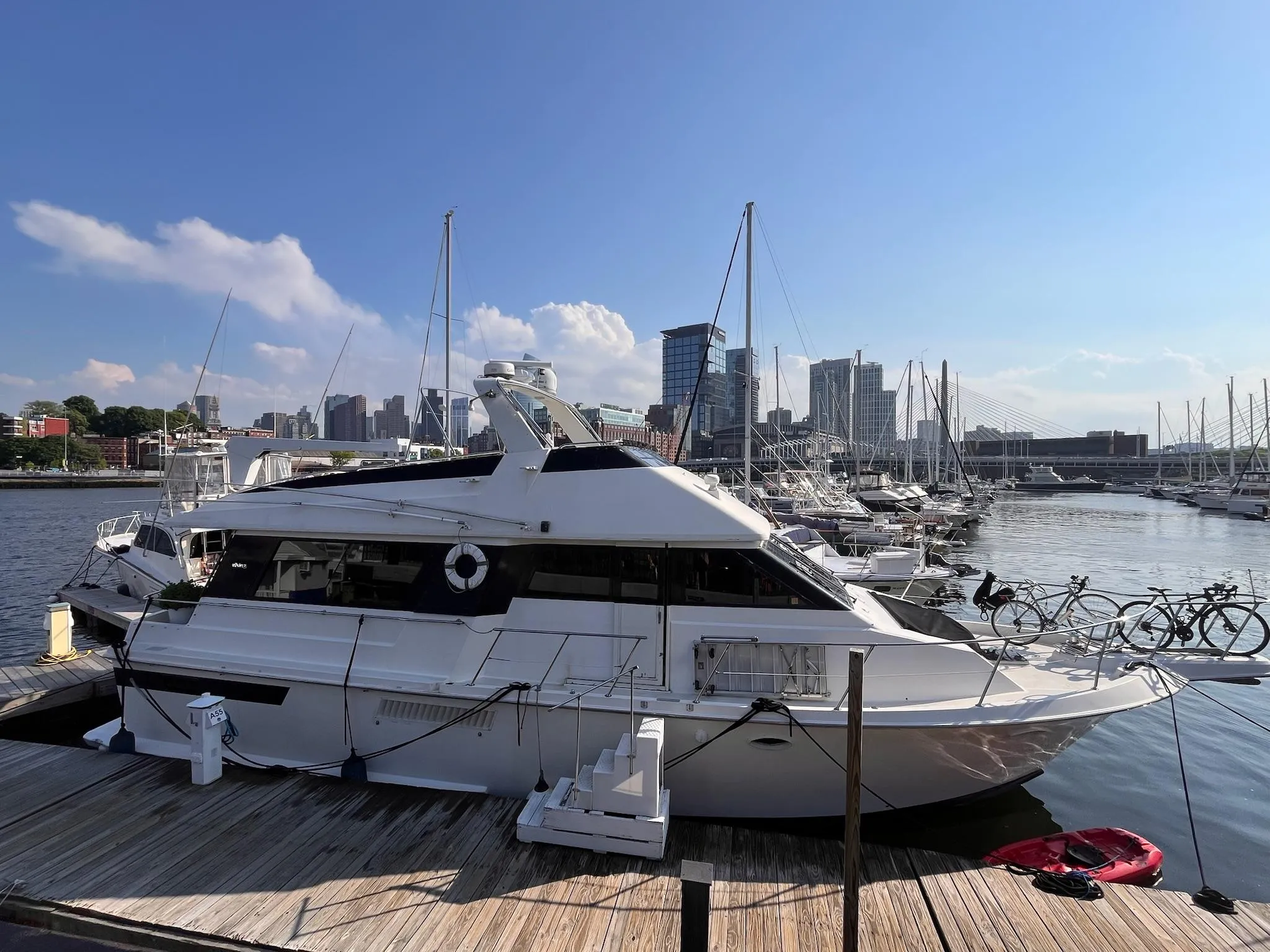 The main (upper) deck features a spacious salon/living room area with private staircase down to owner's cabin, then a large galley area complete with upright fridge, dishwasher, stove, and oven. Lower helm and breakfast nook are forward on the main deck. All the way aft is a sliding door to a large aft deck offering million dollar waterfront views from the comfort of home wherever you are.