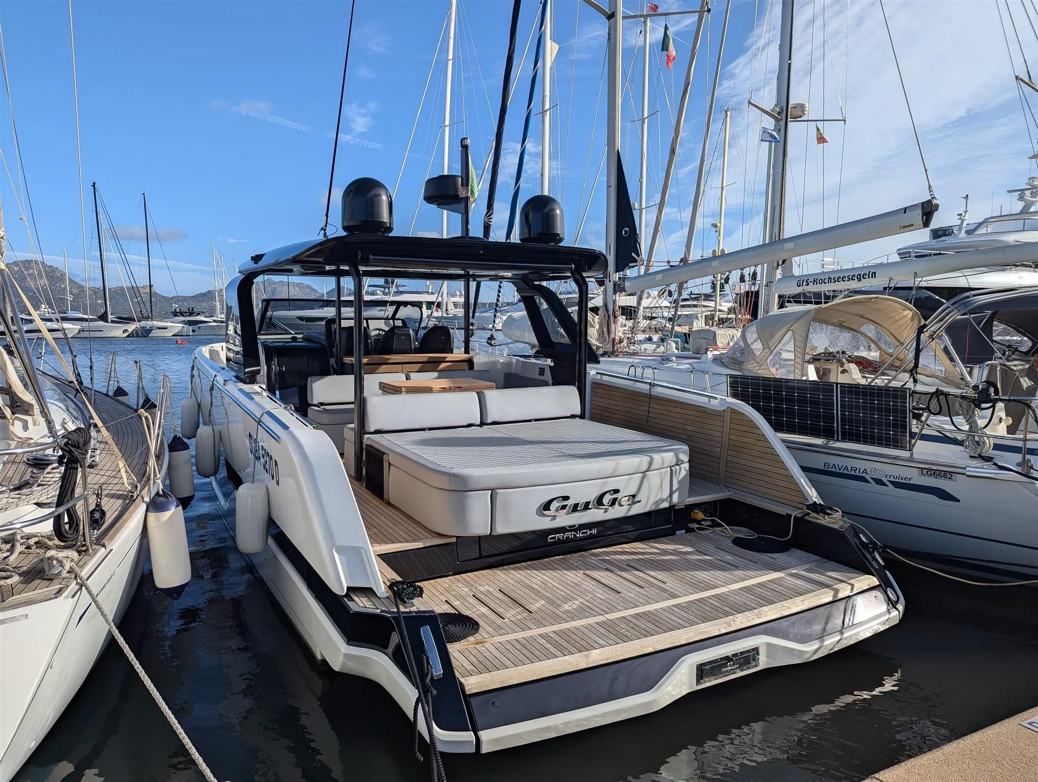 Il Cranchi 46 Luxury Tender è un walkaround di 46 piedi, con caratteristiche distintive che lo rendono ideale anche come dayboat o express cruiser. Guardandolo si avverte immediato un senso di originalità, si percepisce la forza e la bellezza di un'idea. L'intero perimetro dello yacht può essere percorso con passo sicuro sui trincarini camminabili, senza mai incontrare ostacoli. Risulta così estremamente comodo spostarsi da centro barca - dove si trovano console di guida, bar e tavolo - verso prua e verso poppa dove si incontrano ulteriori sedute e spazi confortevoli: si creano così tre centri di gravità tra loro ben distanziati e allo stesso tempo perfettamente collegati per offrire all'armatore un luogo sicuro, dedicato al piacere, al relax e alla convivialità. Come è chiaro, questo yacht invita alla vita all'aperto, ma non per questo il Cantiere ha trascurato gli spazi sottocoperta con eleganti soluzioni convertibili estremamente funzionali. La dinette infatti si può trasformare in un'area notte che si aggiunge alla comoda cabina di poppa a tutto baglio. Il bagno è completo di box doccia separato. Questo 46 Luxury Tender è veramente come nuovo, full optional, con poche ore di moto.