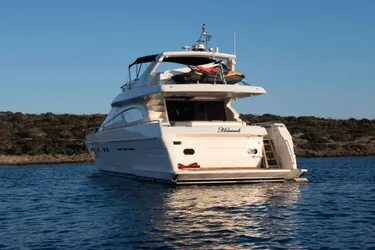 She is a 22m luxury yacht, built by Ferretti in 2002. Her top speed is 28kn and she boasts a maximum cruising range of 300nm at with power coming from two 1250hp MAN diesel engines. She can accommodate up to 8 people.