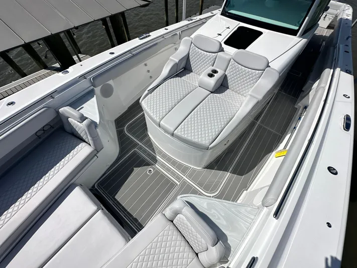 Finally, a large center console yacht with the sophisticated design to perfectly balance speed, ride, comfort, and all of the luxury of your “dream” yacht. The bow area is dual purpose with seating to accommodate guests on the forward-facing lounger or around bow seats and table that convert to a large sun pad for lazy days catching rays; or remove the cushions for a fully functional fishing platform. The luxuriously functional cabin with queen sized berth, storage galore, galley kitchen, and separate head/shower compartment is the perfect place for air-conditioned comfort on hot days as well as longer trips with overnight stays.