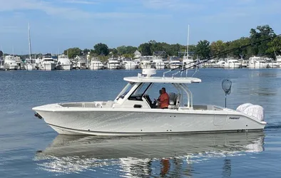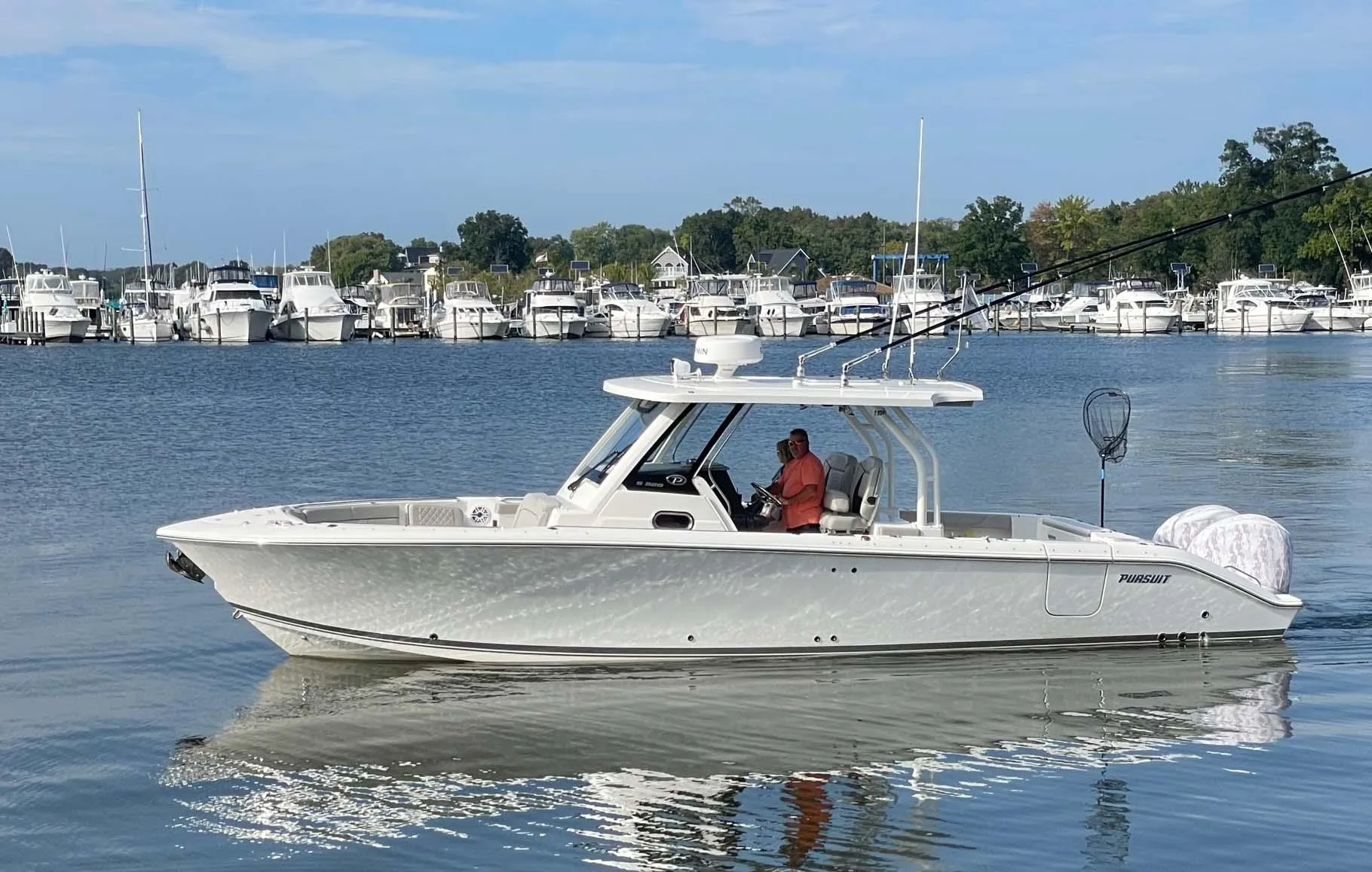 If you're in PURSUIT of the perfect combination of a QUALITY fishing machine that can also satisfy your comfort and entertainment needs, you'll find it all in the Pursuit S328 sport! This one is being lift kept (NO Bottom Paint) and used in brackish water on the Chesapeake Bay with only 340 hours on the boat- most at trolling rpm's! In addition to the long list of standard features on the S328, you'll have an electric Sunshade, Bow thruster, lots of covers to keep the boat fresh, Helm Enclosure Package, Garmin Dual Screen Electronics Package with Autopilot, Outriggers, Underwater Multi Color lights, 12V cockpit refrigerator, bow sun pad with removable cushion, bow Mediterranean shade, transom mount removable ski-tow, premium Stereo upgrade too!