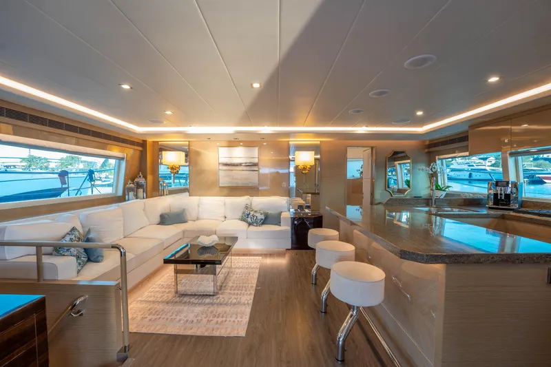 This 2021 Horizon PC60 features the highly sought-after on-deck, full-beam master stateroom and a fully enclosed skylounge flybridge complete with a convenient day head, creating an ideal layout for both extended cruising and entertaining. Powered by twin MAN 800HP engines, recently completing their full 4-year service, the vessel delivers confident performance with exceptional reliability. Accommodations include four staterooms and four heads, offering generous space and privacy for owners and guests alike.