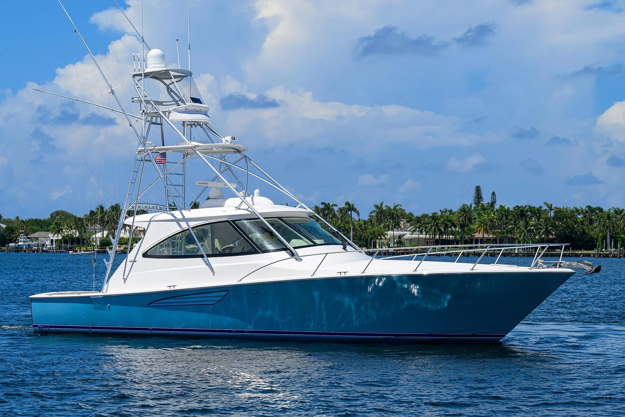 She was built like a Viking factory showboat and includes all of the desirable options such as the upgraded 1,200 MAN CRMs, SeaKeeper 9 Gyro, ZF Joystick Maneuvering System with Station Keeping, Upgraded Hydraulic Bow Thruster, Release Marine Teak Battle Saddle, Stunning Custom High Gloss Walnut Interior, Upgraded Cockpit Refrigeration/Freezers, ElectroSea System, Teak Cockpit and Mezzanine, Eskimo Ice Chipper, Custom Rod Storage Overhead, Helm-deck air conditioning, Custom Palm Beach Tower and full array Garmin electronics from Atlantic Marine Electronics upgraded to 8616's in 2020.