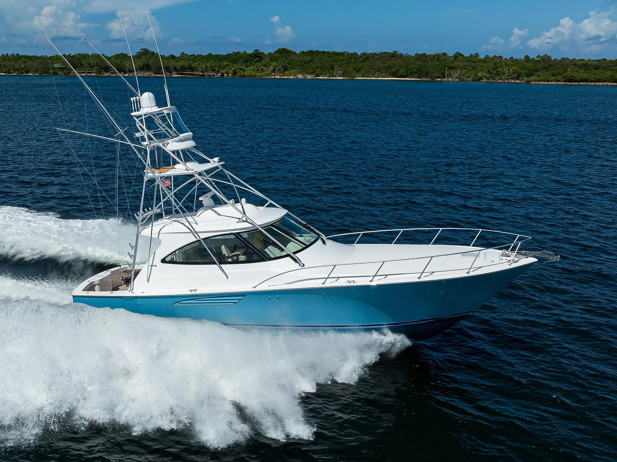 She was built like a Viking factory showboat and includes all of the desirable options such as the upgraded 1,200 MAN CRMs, SeaKeeper 9 Gyro, ZF Joystick Maneuvering System with Station Keeping, Upgraded Hydraulic Bow Thruster, Release Marine Teak Battle Saddle, Stunning Custom High Gloss Walnut Interior, Upgraded Cockpit Refrigeration/Freezers, ElectroSea System, Teak Cockpit and Mezzanine, Eskimo Ice Chipper, Custom Rod Storage Overhead, Helm-deck air conditioning, Custom Palm Beach Tower and full array Garmin electronics from Atlantic Marine Electronics upgraded to 8616's.
