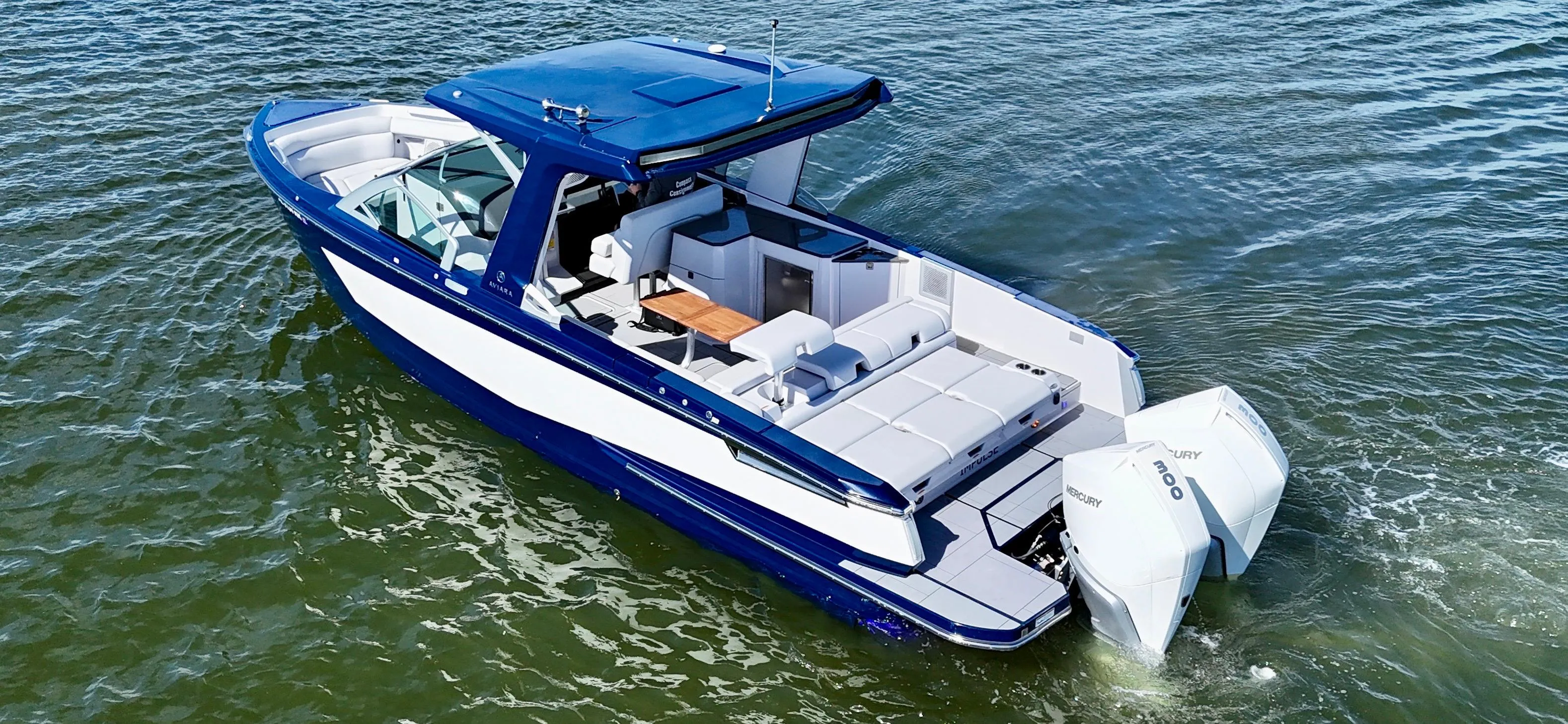 This AV32 built by Aviara is a true must-see to believe. This boat has been lift-kept, undercover behind the owner's home (cover taken down for repairs in photos). The cover has been replaced and it currently protecting the boat. The full boat cover is currently covering the boat to protect it from the elements. From walking up the boat to being behind the helm, this boat expresses elegance and fine craftsmanship. Powered by a pair of Mercury Verado 300s with ONLY 160 HOURS. This AV32 is easily controlled with the Mercury Joystick, auto trim feature and autopilot capabilities. You'll love the ease of the touchscreen helm controls for everything from your hardtop shade extender to your cooled cupholders. There is so much to list on this boat, please take the time to read the full list of options as well as enjoy nearly 80 detailed pictures of this beautiful Aviara AV32