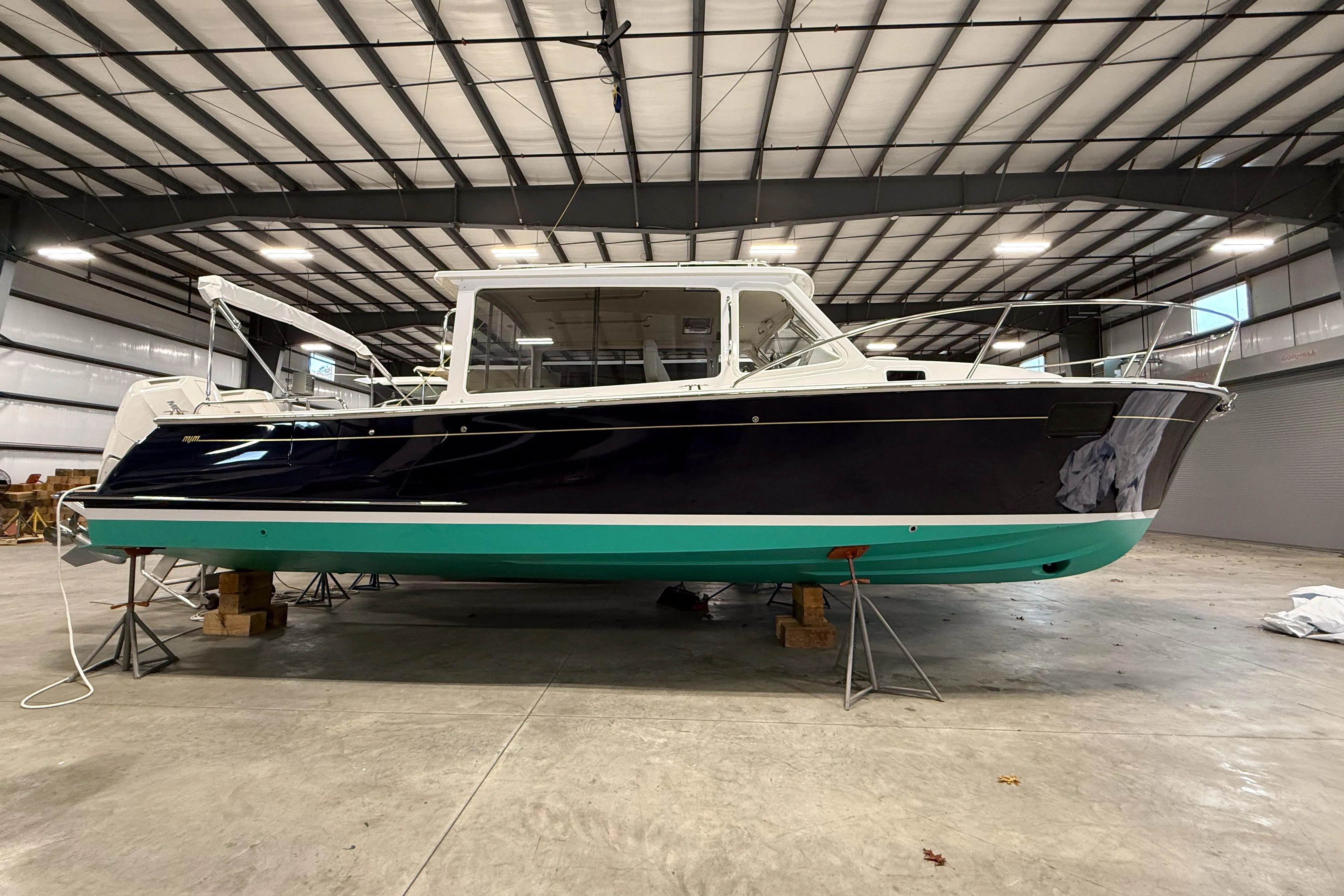 The MJM 35 is made even more beautiful in the classic Flag Blue hull and Gold cove stripe.