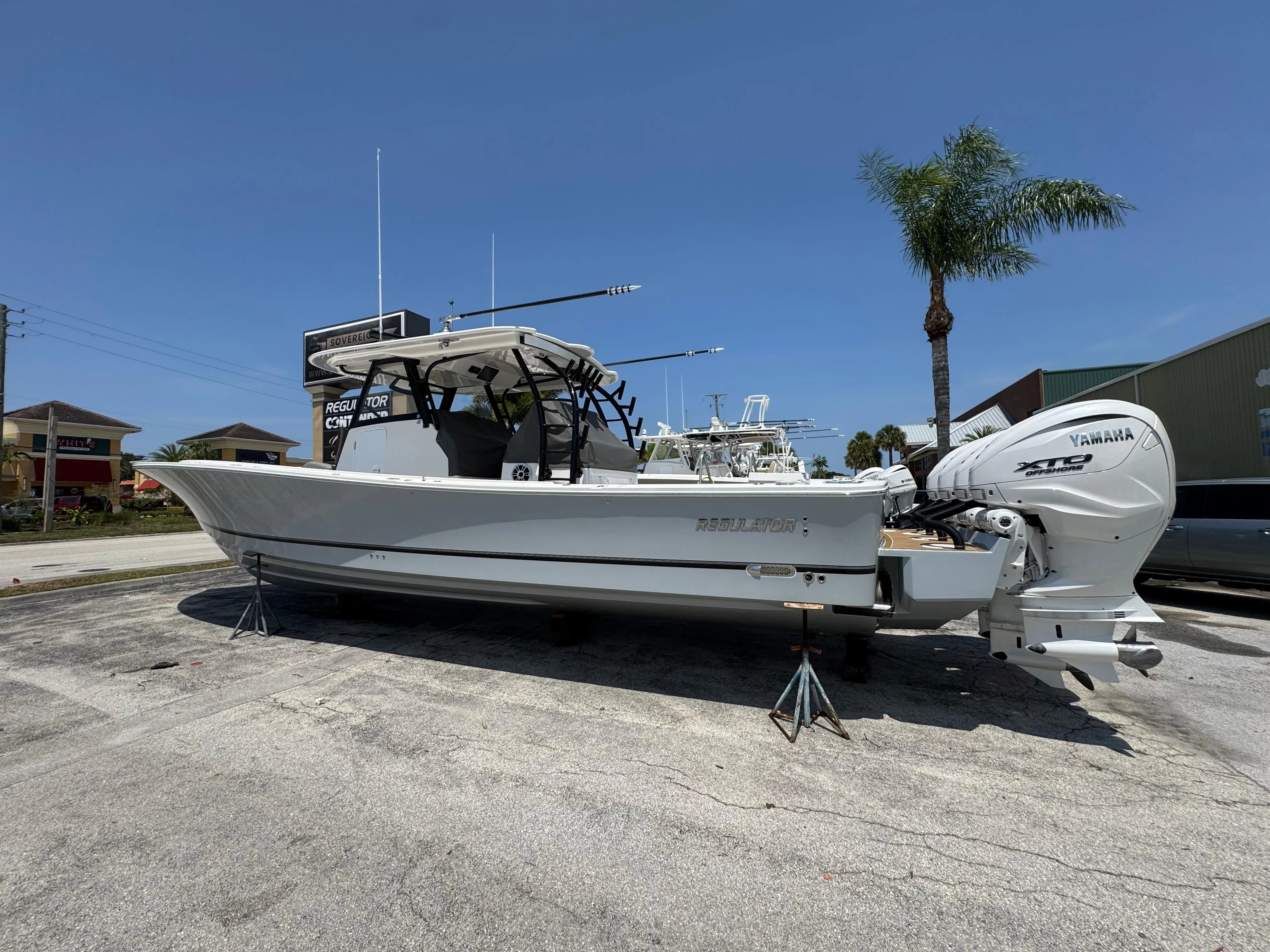 Powered by quad Yamaha 425s with Helm Master® EX and equipped with Seakeeper® 5, the 41 meets your every offshore need. The new Offshore Command Center features Garmin® Multi-Function Display with Digital Switching and Monitoring, along with proprietary Regulator MyHelm™ interface to seamlessly and intuitively connect key functions in one application – with wireless key fob to trigger lighting, batteries, and more as you approach or disembark with the touch of a button. Serious anglers will love the optional Taco® Grand Slam 500 outrigger bases with 20’ HD Carbon Fiber telescoping poles and huge livewell and fishbox capacity. Aft mezzanine seat with prep & tackle center and overhead SureShade® provide additional cockpit seating without compromising fishing amenities. Easy tower access makes the dual helm even more attractive and below deck, the newly-redesigned cabin features Chilewich interiors, galley kitchen, double berth, and spacious head with shower, allowing you to accommodate friends and family with ease.