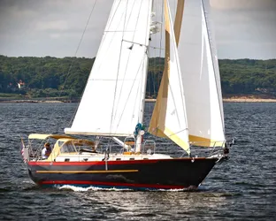 Deck to hull connection: Integral hull & deck flanges mated & bedded in polyurethane and fastened with stainless steel thru-bolts. Deep bulwarks with heavy teak cap rail, hand fitted with butterfly joints. - Deck balsa cored. Plywood core in hardware mount areas. - Deck has molded-in nonskid pattern. - Hull finished with 3 coats epoxy below waterline. Deck Equipment - All cleats, winches, turning blocks, pulpits & stanchions are thru-bolted with metal backing plates & caulked on both sides with polyurethane. - 30" high stainless steel double rail bow & stern pulpits with running lights & 30" high double lifeline stanchions. - Stainless steel boarding gates, port & starboard, with double lifelines. - Extended s.s. bow platform & stem fitting w- 2 anchor rollers & locking pins. - Divided bow chain locker for two anchor rodes w- one anchor deck pipe. - Stern chain locker to starboard with deck pipe & stern anchor roller. - Chrome plated bronze deck hardware includes: All hinges, hasps, jam cleats, chain pipes, deck fills, etc. Two Harken #53.2 STC two speed, self-tailing genoa sheet winches. One Harken #44.2 STC two speed, self-tailing mainsheet winch. Three Harken #40.2 STC two speed, self-tailing for halyards & utility. Six 7" x 12" and eight 4" x 7" opening ports (2 in cockpit). CE approved. Two 12" & two 10" bow mooring cleats (4 total), 3" hawse pipes. Two 10" open spring cleats amidships. Two 10" stern mooring cleats with 9" chocks. One anchor deck pipe on foredeck & one aft. - Harken mainsheet traveler over companionway. - Harken deck sheave organizers. Spinlock rope clutches on coach roof. - 2 Bomar double opening hatches & 2 Bomar vent hatches. CE approved. - Two Vetus dorade cowl ventilators. Six teak handrails on cabin house. - Inboard & outboard genoa tracks with Harken cars. Harken foot blocks. - Fiberglass seahood, teak companionway sliding hatch & drop boards. - Stern mounted s.s. swim ladder with teak treads, boarding gate & overboard retrieval line.