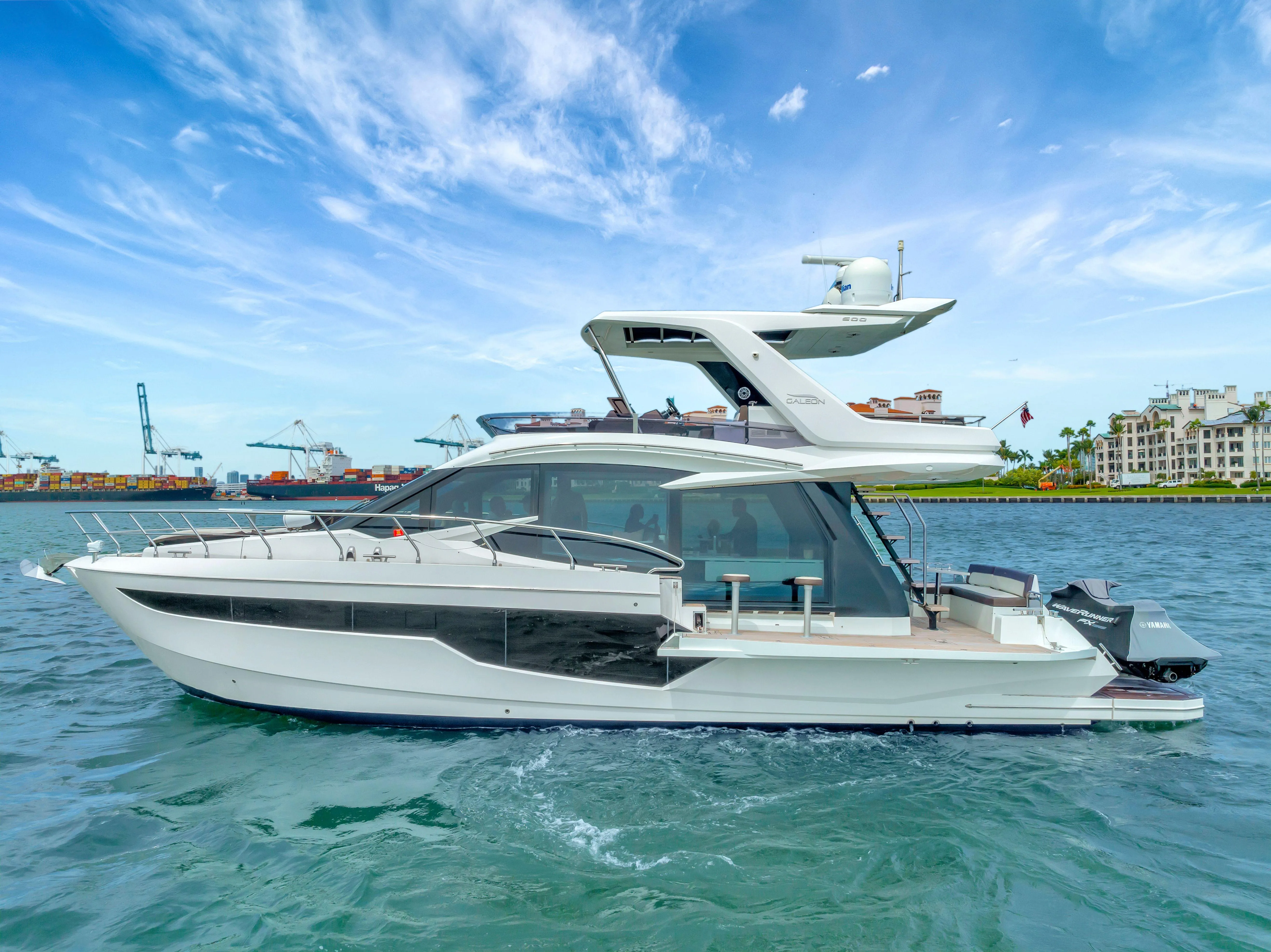 Experience luxury on the water with the 2020 Galeon 500 Fly. This stunning yacht is the perfect intersection of luxury and performance. It is one of Galeon’s most award winning and innovative yachts, setting benchmarks in both luxury and design. Powered by Twin Volvo Penta D11-670 engines, the vessel incorporates Joystick technology, Raymarine navigation, Gyro stabilization, Bow and Stern thrusters, and Northern Lights generator. Infinity features the preferred three stateroom, two head layout, aft galley (port) with retractable side windows, and aft sliding doors that serve to fully blend interior and exterior spaces seamlessly. Upgrades includes port side fold down deck with expansive counter/bar seating connecting to galley, optional exterior bar stools (port expansion deck), starboard expansion deck with retractable window and convertible sofa/lounge, beach mode package, fly bridge with multiple seating areas and sun lounges, and countless upgrades and luxury interior finishes throughout. There is a separate garage with room for a tender. She is the perfect yacht for both day and long distances cruises, and sure to turn heads in every port.