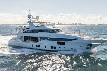 Incorporates features usually found on much larger yachts, including huge panoramic windows, a garage, a dedicated beach club, expansive forward seating, sunbed and Jacuzzi areas, a soccer field-sized sundeck, a dedicated gym, and automated terraces in the Master Stateroom.