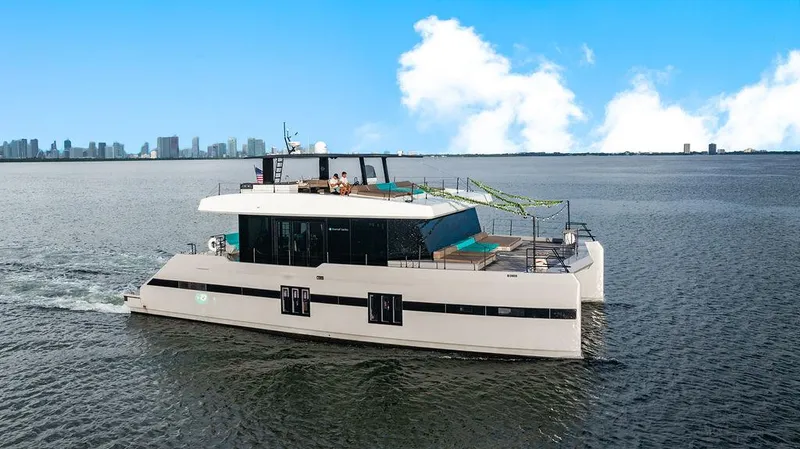 Welcome aboard this beautiful 2018 Sunreef Supreme 70 Power Cat Yacht. She has has recenlty entered the market and is now offered for sale. Island Majesty, which was custom built with open budget to achieve the most elegant, spacious and economical Yacht in her class for long range crusing in style. Her high contrast finishes in gray, with both black and white accents make her a head turning show piece. Performance wise she has everything you could ask for with a cruising speed of 15kts and a top speed of 25 knots. Powered by twin 800 hp Volvo IPS main engines deliver superior fuel economy and brisk maneuverability with ease. Entertaining is the name of the game on this great platform. From her thirty-two-bottle wine chiller to her full bar setup in the spacious salon, no expense was spared during the build process and outfitting this Yacht to perfection. The fit and finish quality of this Sunreef Yacht with her spacious interior exudes luxury in every portion of the vessel. As you traverse the deck, you will quickly recognize the extent of her vast amount of deck space not found in any other Yacht in her class. The Flybridge is equally as impressive with over 300 sq ft of deck space and abundance of seating, perfect for hours of relaxing and or entertaining. Island Majesty plays host to an opulant three state room layout with two crew quarters forward. Luxury and privacy are found in abundance in the full Starboard side ultra-modern Master Stateroom. The Flybridge helm is equipment with the Latest Garmin Navigation electronics as well as interfaced for an additional sound system or DJ equipment to be quickly connected to the Yachts high end custom sounds system. This Yacht has it all and is perfect for both private and charter programs. Whether your itinerary includes long range island exploration or hosting an evening of entertaining guests, the Island Majesty will far exceed all expectations This is the Yacht that you have been waiting for! The seller will consider fractional ownership to qualified buyers. Call today to arrange a private showing.