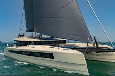 Her construction credentials are exceptional: full carbon throughout, launched by the same yard responsible for the AC40 America's Cup racing platform. The result is a hull that is as fast as it is refined.
