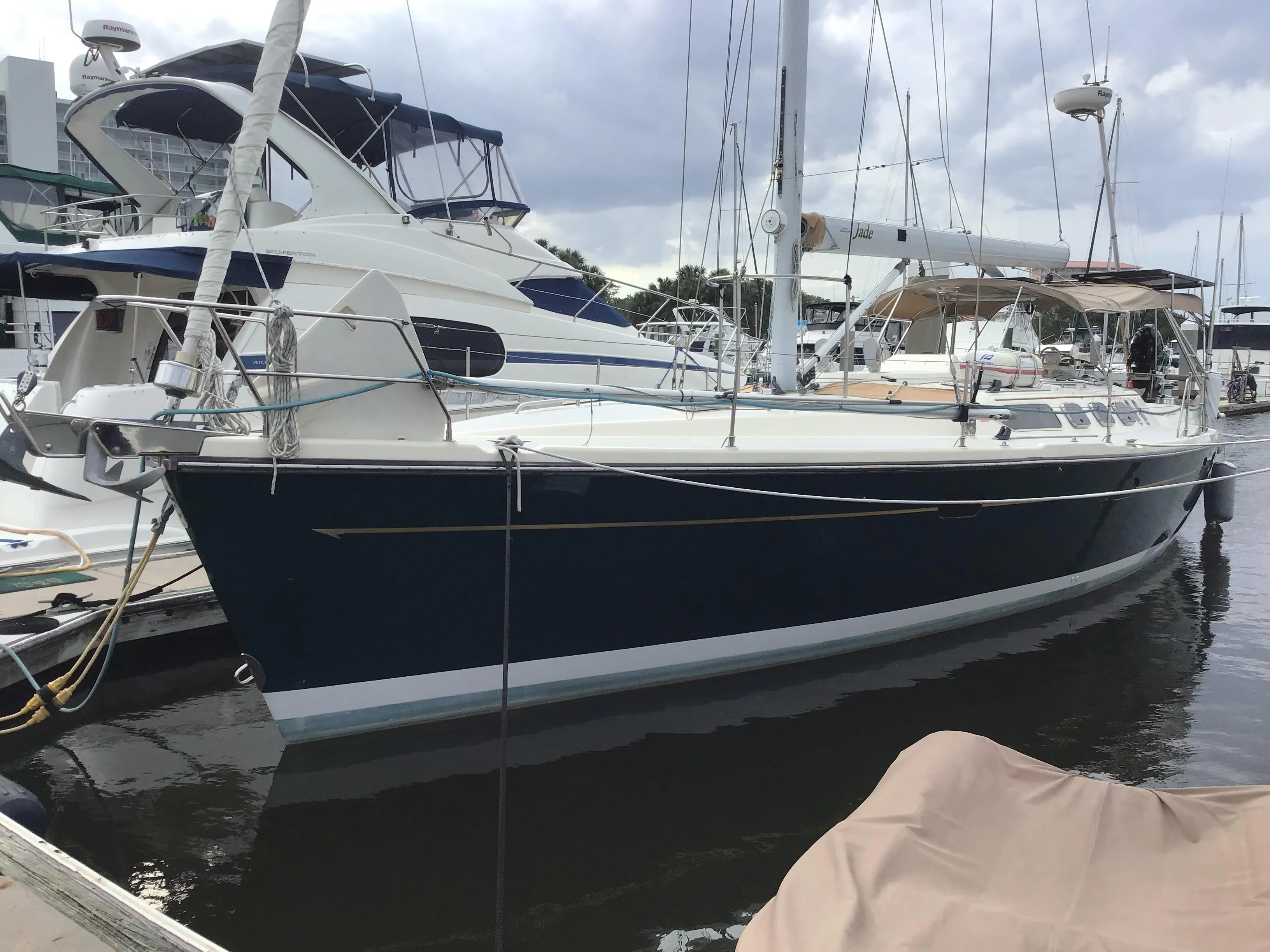 Jade is a custom sailboat with over 160 upgrades over the standard 460, making her the Hunter-Helsen Signature 470. With only two ever built, Jopie Helsen of Sailors Wharf took great pride in the conversion of these vessels. The biggest change over the standard 460 is the custom sugar scoop transom, which added a foot and a half to the waterline, providing better performance and a cleaner look. Helsen also worked with Doyle Sails to create a performance sail package. If you are looking for a sailboat that can take you anywhere, Jade was built for that purpose and is in immaculate condition!
