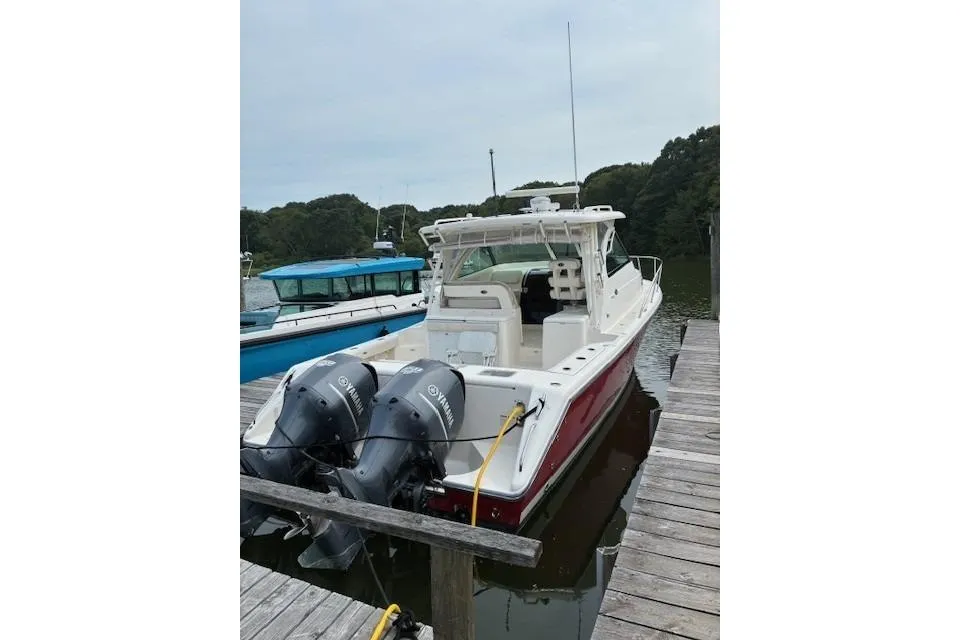 The OS 345's hull has been specifically designed for twin Yamaha 350 hp 4-stroke engines, which provide optimal performance with minimal horsepower. Standard bow thrusters will give any captain the confidence to dock in close quarters, wind or strong currents. The express design includes an open helm with optional bridge deck cooling with air conditioning and an aft canvas enclosure so you can escape the elements without escaping the view. This layout also affords quick access from the helm to the cockpit when you have more screaming reels than anglers. The cockpit includes ample seating and an electric grill for entertaining and a host of fishing features including a recirculating livewell, a comprehensive rigging station with locking tackle drawers, insulated fish boxes and enough elbow room that you're not running into each other.