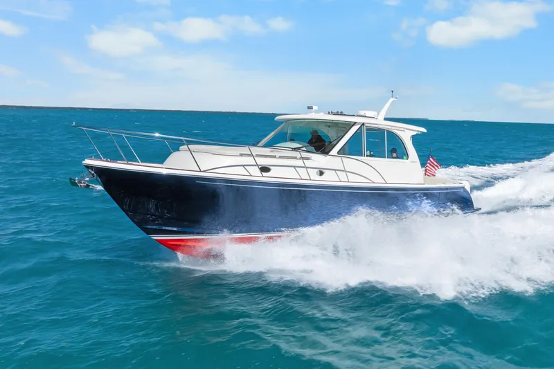 “Jenny B” was purpose-built by an experienced yachtsman with family adventure and entertaining at the forefront.Her classic Flag Blue hull, red boot stripe, and faux teak accents deliver an unmistakable Hinckley presence. She is the only Hinckley Sport Boat equipped with both a full bow sun cushion and an onboard Spot-Zero water purification system.