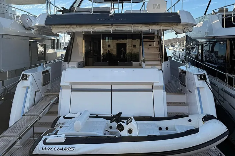 The 24-meter Ferretti 780 is an impressive flybridge motor yacht that combines fluid Italian design with refined comfort and strong performance. Her sporty yet elegant exterior lines, together with expansive glass surfaces, create a bright, spacious, and sophisticated interior atmosphere.