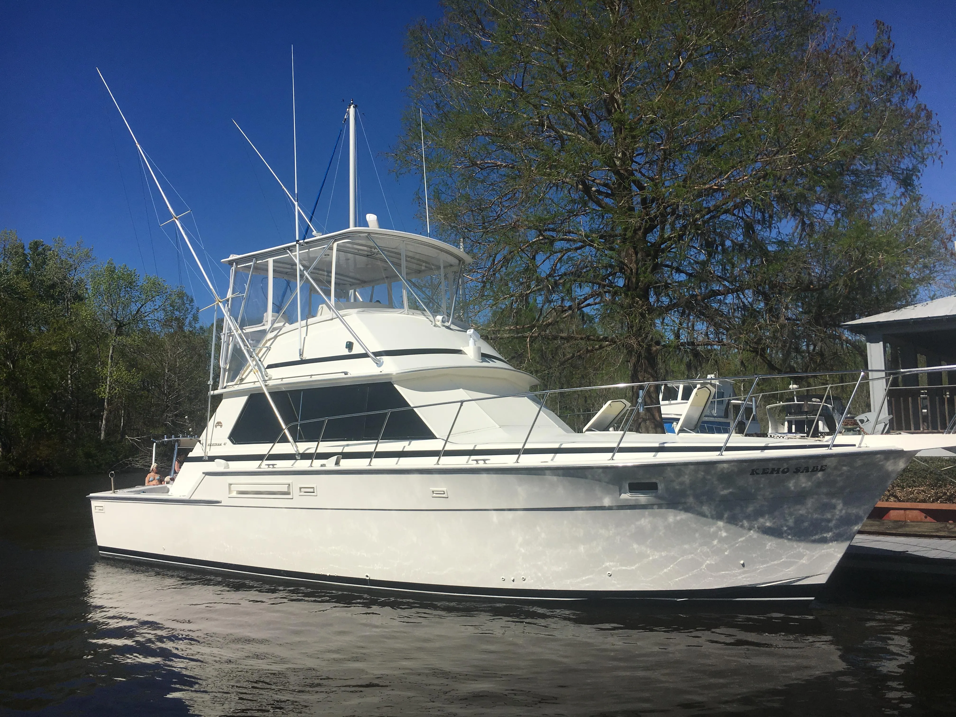 "Kemo Sabe" is an excellent example of the classic 42 Bertram Convertible! Refit in 2003. Repowered with Cummins 6CTA8.3 480 Hp diesels, 1400 hours. The engines are coupled to ZF 280A gears. New (2023) Kohler Generator in sound shield, 80 hours. Custom hardtop, custom helm with Garmin electronics package. Painted from the rub rail up, front windows glassed in for a more modern look! Teak and holly sole throughout the cabin, custom galley counter with pullout drawer refrigerator/freezer. Bottom Job and zincs (2025), she’s in the water ready to go! Great boat, legendary hull with Cummins power!! Cruise 23 knots at 1900! She’s in Montauk. Bring offers and your fishing gear!!