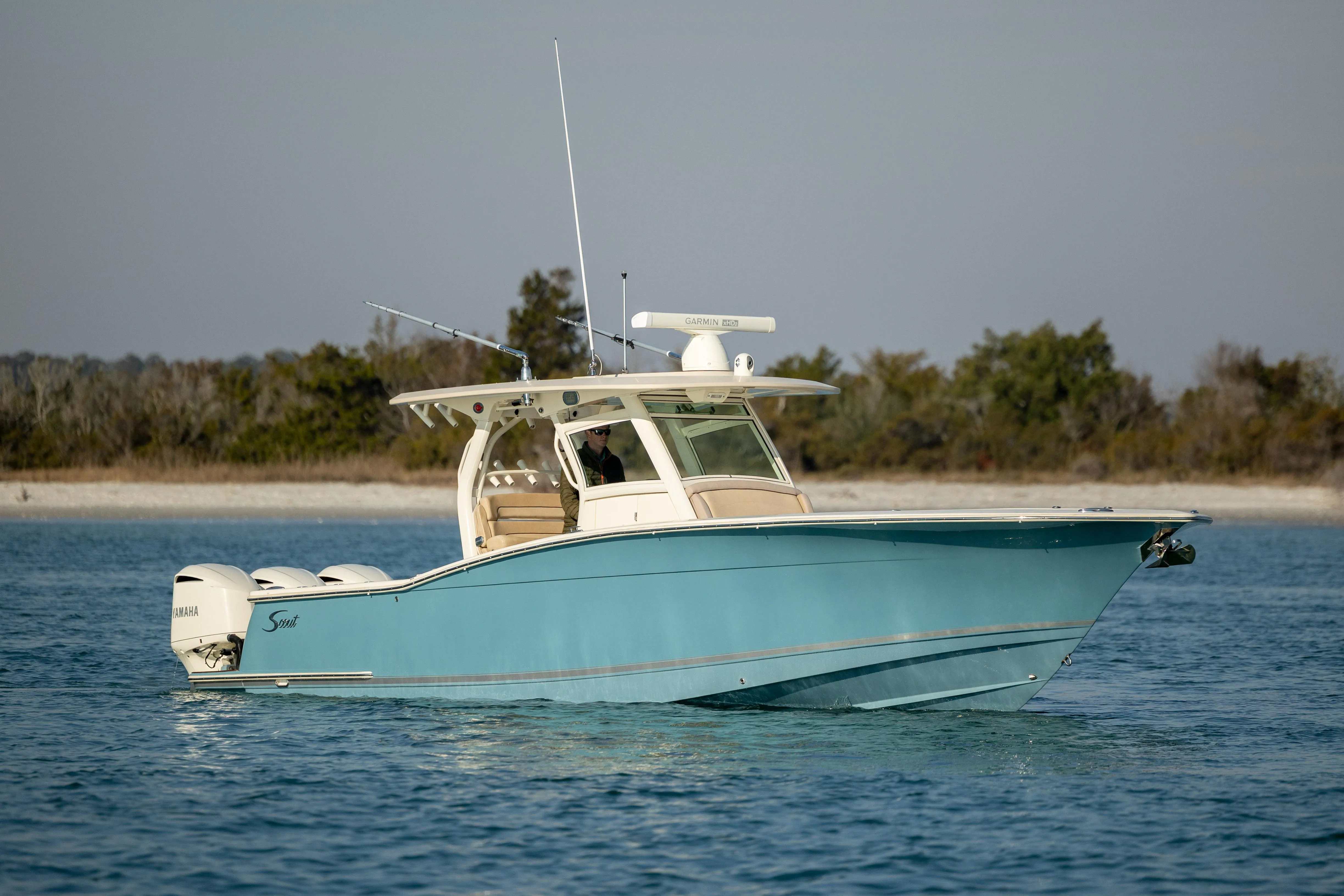 This is an extremely clean and well-kept 2017 Scout 350 LXF, when not in use she is kept on a 2023 Magic Tilt Triple Axle Trailer. This boat comes equipped with Garmin Electronics, Yamaha Helm Master Joystick, Taco Outriggers, Helm AC, and Fusion stereo. The 35 Scout is a great fishing platform, perfect for Island hopping, and makes for a great yacht tender.