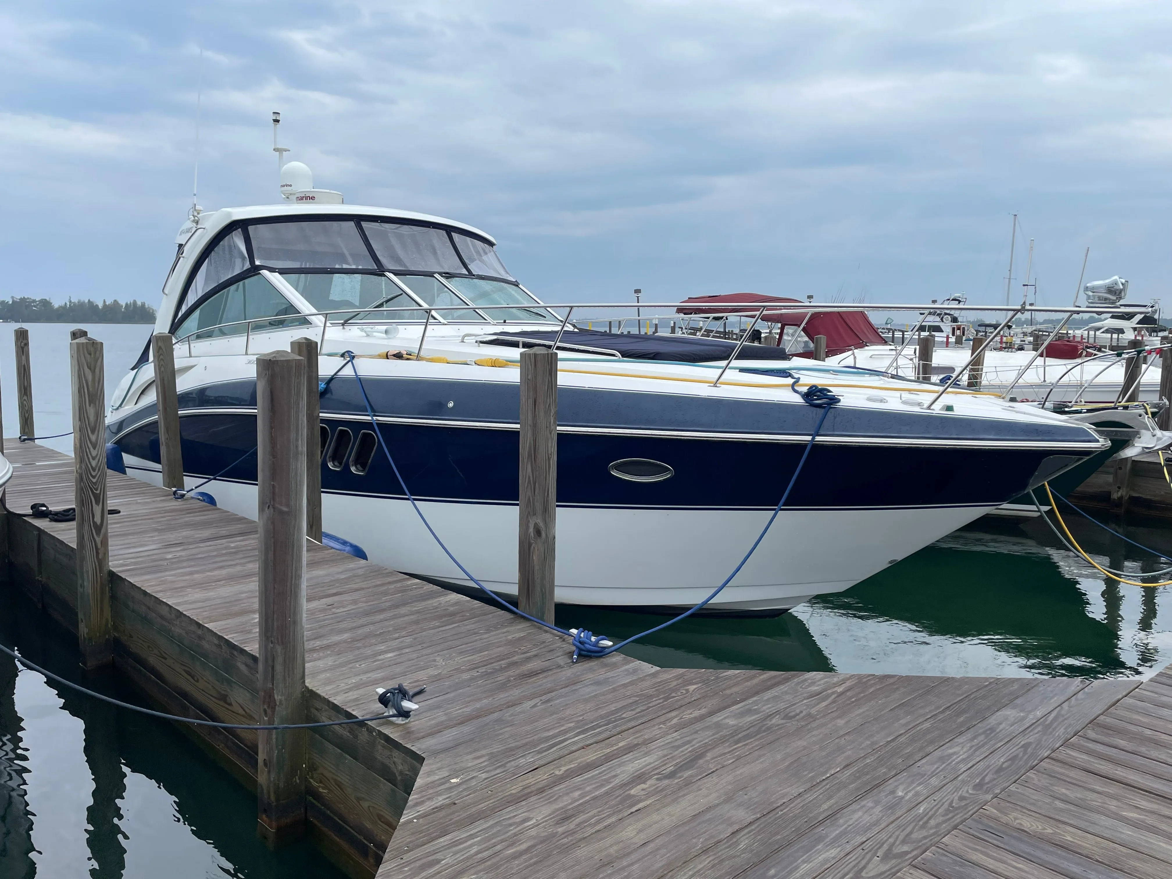 Powered by twin Mercury 8.2L engines (475 hours), this 38-foot cruiser offers a spacious 12’6” beam, a comfortable 6’6” cabin headroom, and ample storage with 300-gallon fuel, 64-gallon water, and 40-gallon holding tanks.