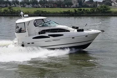 The Cruisers 405 Express Motoryacht offers boating enthusiasts a virtual express layout on the upper deck while providing full aft cabin comfort below. The 405's cockpit features the kind of comfortable seating associated with traditional express boats with virtually no separation between bridge and cockpit. A full express-style windshield provides exceptional weather and wind protection. An aft-deck hardtop with wing doors and full weather enclosure is aboard the 405. "Knot Available" also has the highly sought after optional hardtop that covers the bridge deck. Below, the 405 Express Motoryacht will delight owners and guests alike with its warm cherry interior and natural light. The bright, airy salon features a large settee/dinette and a large Flexsteel L-shaped convertible settee/sofa that converts to a double berth to sleep (2); and wonderful views all around due to the imaginative window treatments on each side. There's also a fully appointed galley with large, upright refrigerator/ freezer. A luxurious master stateroom is located aft and features a full walk-around queen-size bed, generous master head with separate shower and lots of seating and storage. A second stateroom is located forward with private head access and separate shower; it also boasts a centrally located queen-size bed.
