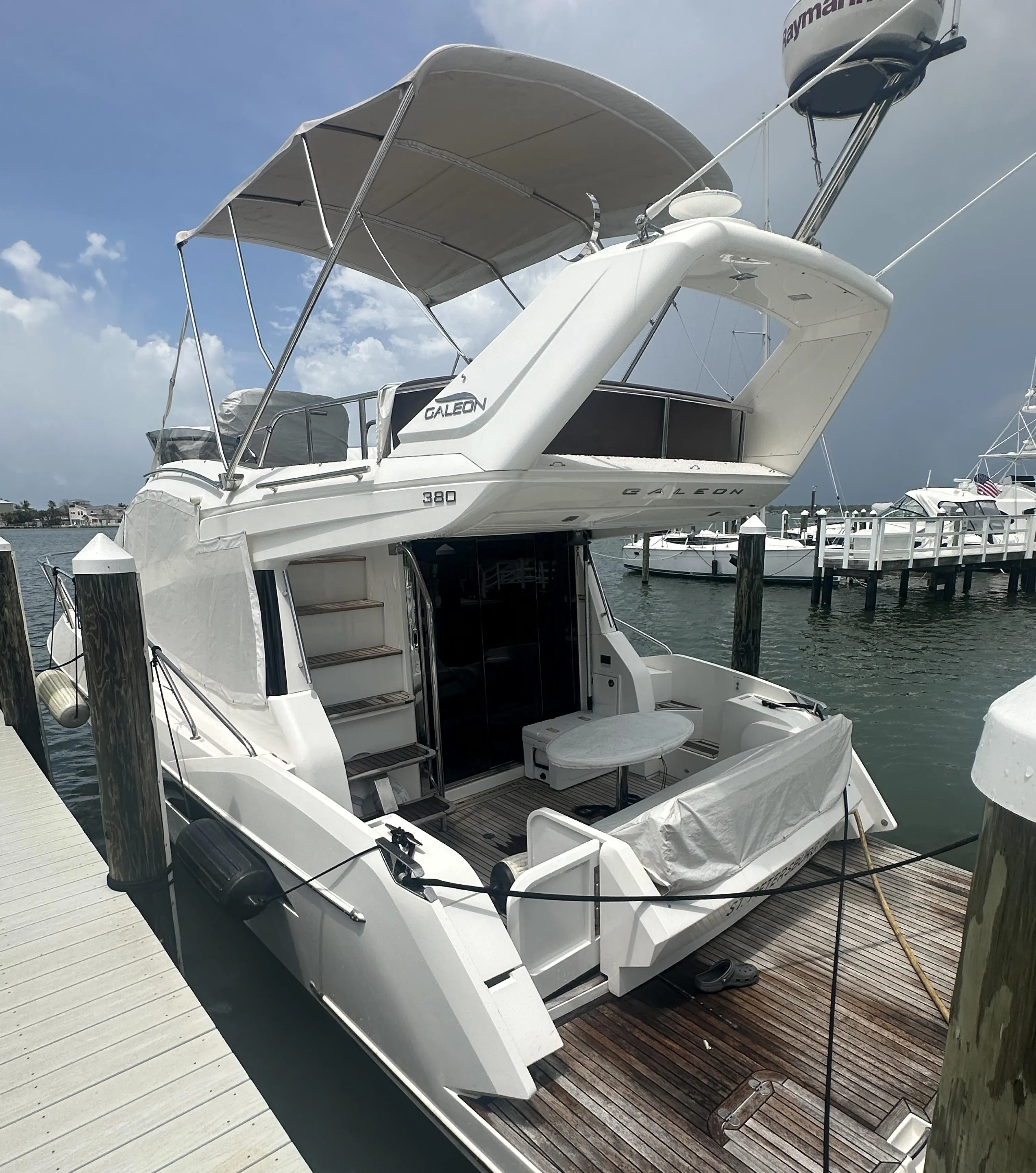 The Galeon 380 Flybridge, is a great balance of luxury, performance, and smart design in a manageable size—ideal for those stepping up from a day boat or downsizing from a larger yacht. The Galeon line offers a combination of luxury, performance, and smart design. "Knot Guilty" offers a comfortable two stateroom layout. The spacious head features a separate shower compartment. There are so many innovative features aboard this great yacht that you owe it to yourself to come see her. The Cockpit settee easily changes into a sun pad or dining area. There is additional space on the forward deck for sunpads with back rests that nest out of the way when not in use. The Flybridge can be quickly accessed and offers sturdy hand rails. There is plenty of room for captain and crew with lounge style seating.