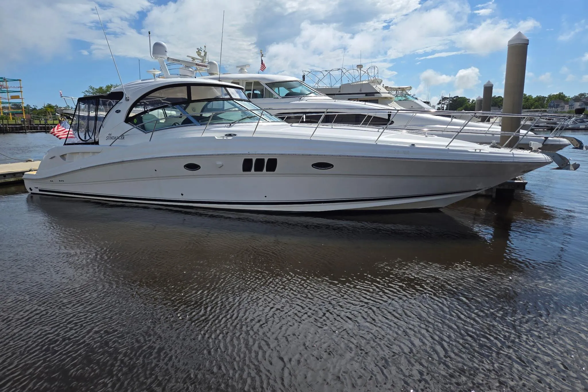 Introducing this stunning 2007 Sea Ray 44 Sundancer, a remarkable motor yacht that effortlessly combines elegance and performance. With an overall length of 45 feet, this vessel boasts a sleek modified vee hull made from durable fiberglass, ensuring a smooth and stable ride on the water. Powered by twin Cummins QSC-8.3 inboard engines, each delivering an impressive 500 horsepower, the yacht promises exhilarating performance and reliability, with only 1100 hours of use. The direct drive configuration enhances maneuverability, making it a joy to navigate. Designed for comfort, the 44 Sundancer features two heads, providing convenience for guests. Its thoughtful layout and stylish design make it perfect for entertaining or relaxing on the water. The name "KNOT ON CALL" perfectly captures the spirit of adventure and leisure that this exceptional yacht embodies. Experience the ultimate in luxury cruising with this exquisite motor yacht.