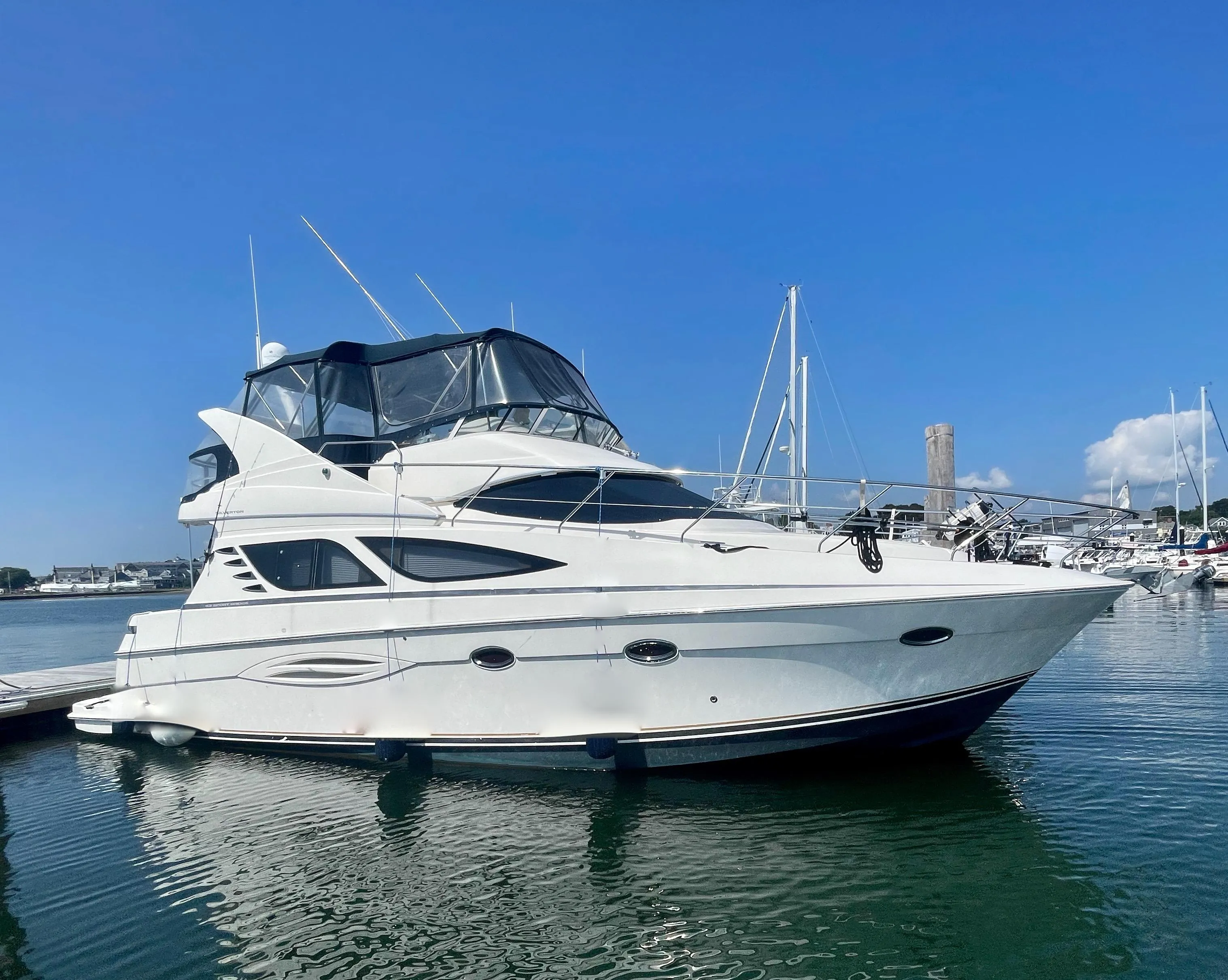 The Silverton 43 Sports Bridge model offers a larger then average salon size due to the full beam design with elevated walkways to the bow from the bridge. Entering the salon through a sliding glass door from the cockpit the area is bright with a satin Teak interior and earth tone soft goods. The vessels electrical panel is to port with a built in locker and storage below. Forward are two matching leather reclining chairs in a Tan Leatherette soft good.