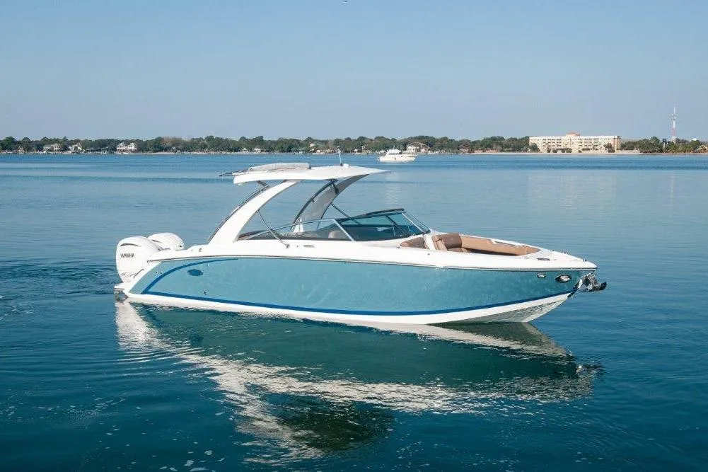 Features like a pump-out head, transom shower, underwater lights, ski tow pylon, boarding ladder, and hardtop with retractable shade add convenience for full-day adventures. Security is covered with a Siren Marine anti-theft system. Clean, stylish, and ready for the water, this 30SC is the perfect mix of performance, luxury, and family memories waiting to happen.