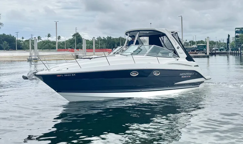 Below deck, the cabin is a testament to Monterey’s commitment to luxury and functionality. The open and airy salon includes a well-appointed galley with a microwave, refrigerator, and solid-surface countertops. The forward V-berth and an aft cabin provide comfortable sleeping arrangements for four, making it perfect for weekend getaways.