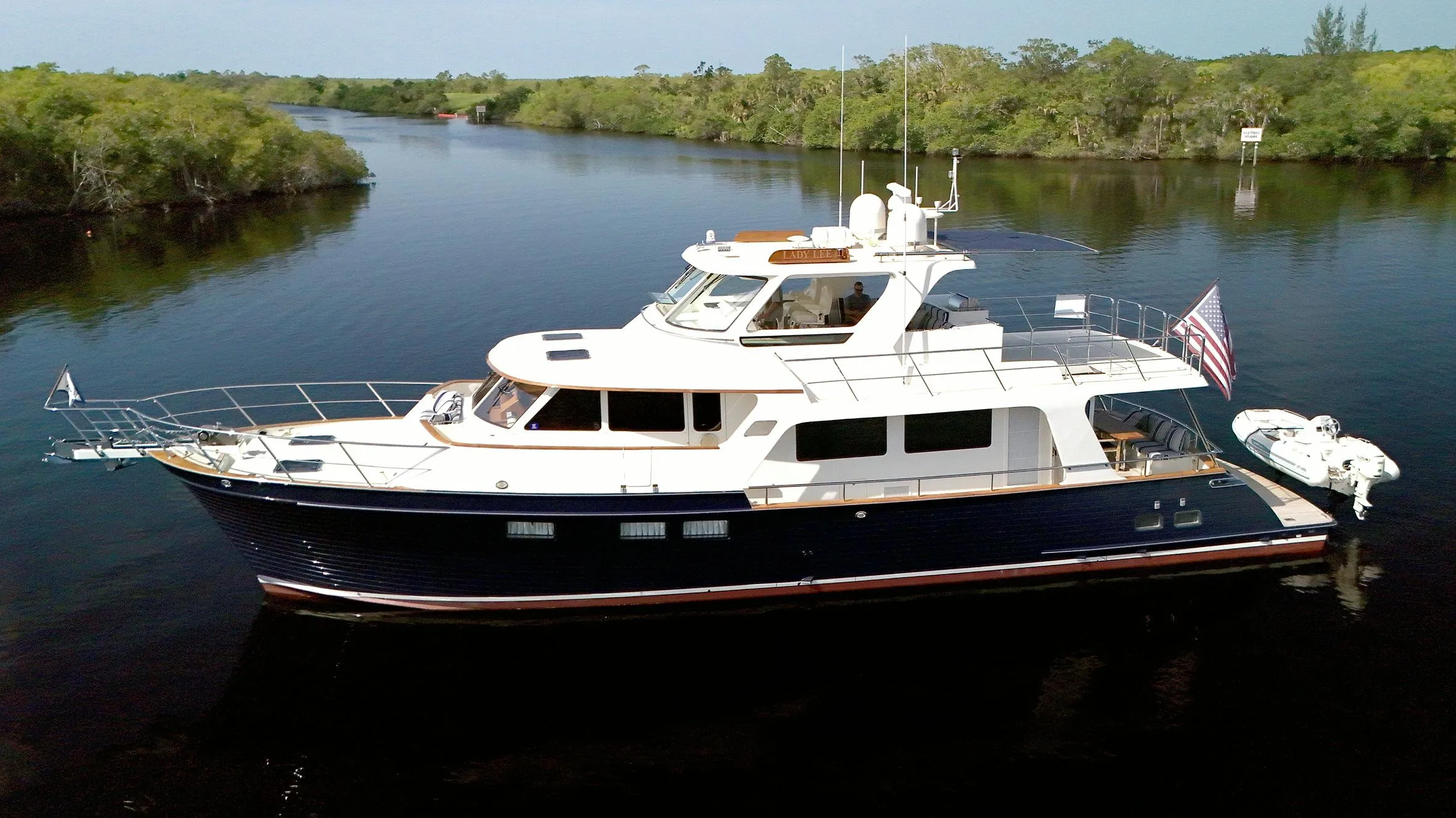 LADY LEE is a semi-enclosed bridge. The semi-enclosed bridge integrates the windshield framing structure into a hardtop and house. This creates a fixed protective windscreen with windshield wipers and defrost. The sides and rear are open which provides the fresh air and cool breeze. On the aft starboard corner of the semi-enclosure, there is a large settee with a high gloss teak table. Fully equipped with an array of electronics. She is a pleasure to run for the Captain.