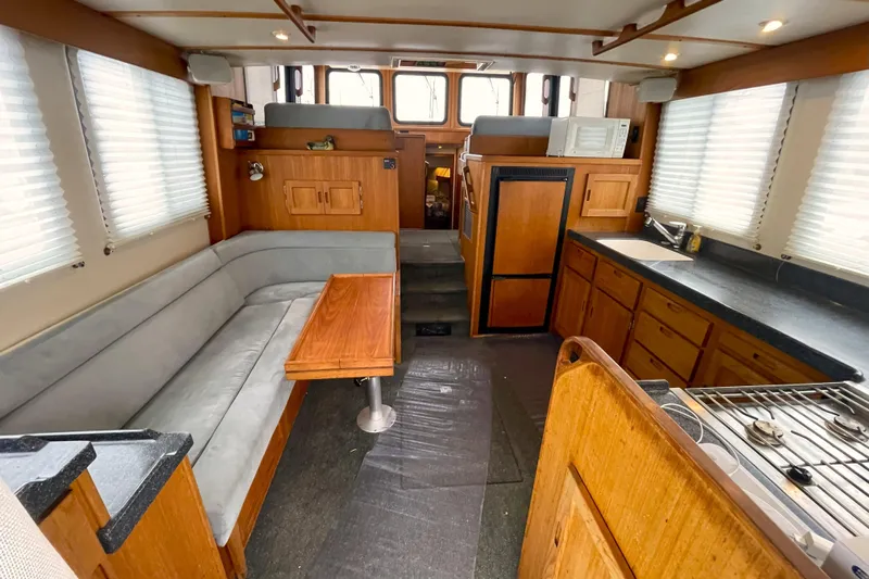 The NT37 offers a handcrafted satin finished teak interior with an open salon/pilothouse design that creates a much larger feel than the trawlers 37' size would lead you to believe. Features include a bright open salon with a large L-shaped settee that converts into a double berth, also a large L-shaped chef's delight galley with quality appliances and plenty of counter space to prepare gourmet meals. The pilothouse offers dual cruising settees and port/starboard sliding deck access doors and a starboard side helm with updated Raymarine navigational eqiupment. Just a couple steps forward of the pilothouse is the owners and guest staterooms and a head with stall shower.