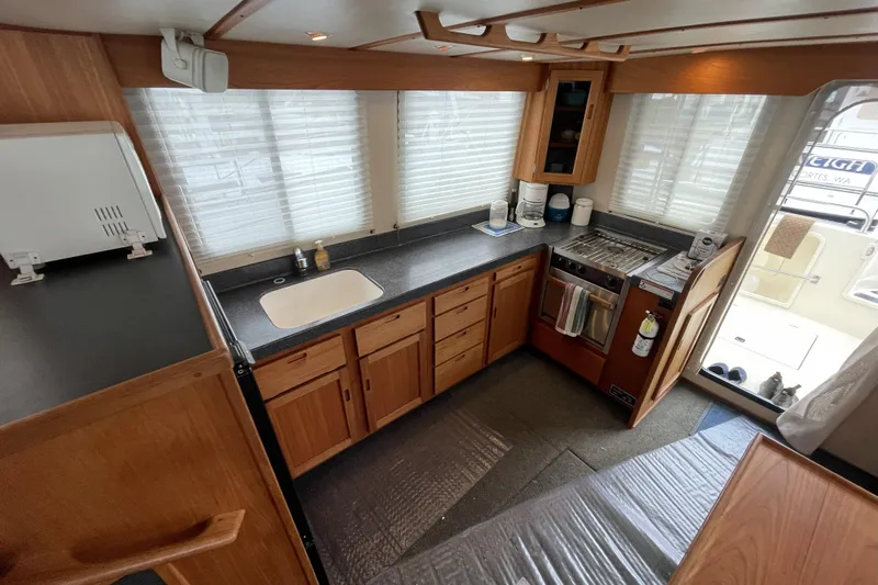 Access to the salon from the aft cockpit is via a Diamond Sea Glaze swing door. The salon walls and cabinetry are a satin finished teak with light colored soft-goods, ceiling panels and blinds that create a bright warm feeling. Salon features include a portside L-shaped settee that converts into a double berth, a teak hi-low dining/coffee table, settee end table/storage cabinet, a large L-shaped galley with solid surface countertops, opening windows and carpeted flooring.