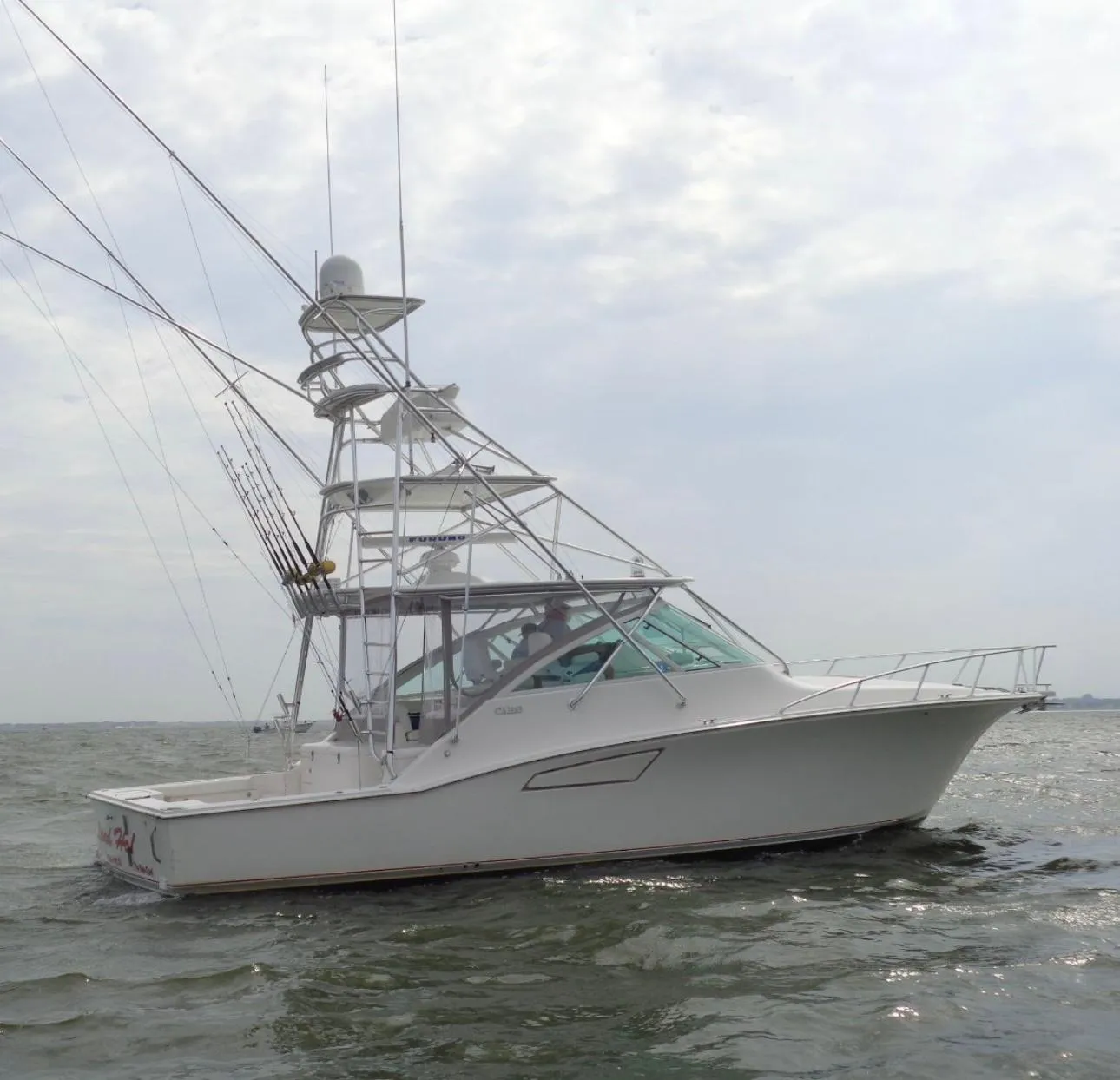 The Cabo 40 Express is a full-on fishing machine with powerful lines and a class-leading 100 square feet of Cockpit space - A top-tier boat when she came out in 2003. Built on a Modified-V hull with a wide 15'9" beam and deep propeller pockets, the Center Helm position of the 40 Express is one of her more notable features. It's three steps up from the Cockpit to the Helm Deck, where an L-shaped settee to port seats eight. Down the Companionway is the Salon with the quality joinery and premium furnishings for which Cabo was known. The L-shaped sofa to starboard converts to upper / lower berths, and a full-service Galley with an electric cooktop and Corian counters is to port, just forward of the large Head compartment with a separate stall shower. A queen berth is in the private Master Stateroom. Standard features include a molded bow pulpit, teak-and-holly Cabin sole, recessed trim tabs, 48-gallon transom live well, fresh water / raw water washdowns, Cockpit bolsters, insulated in-deck fish boxes, bait prep center, lockable rod storage, bait freezer and transom door.