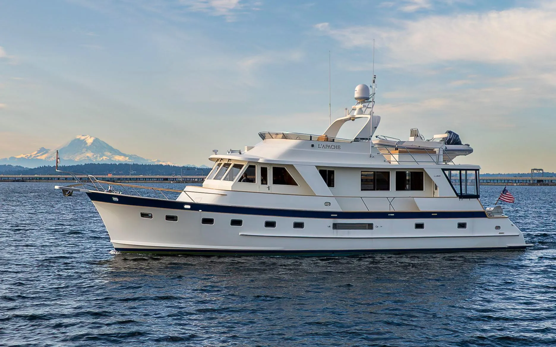 Contact the LISTING BROKER to set up a time to see L'Apache, the stunning Alaskan 65 Flush Deck Cockpit Motor Yacht in her berth at the Seattle Yacht Club. Shown by appointment