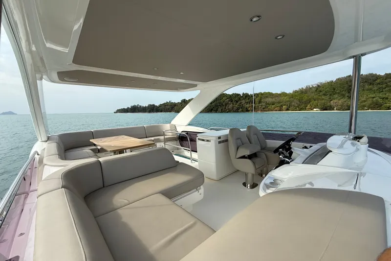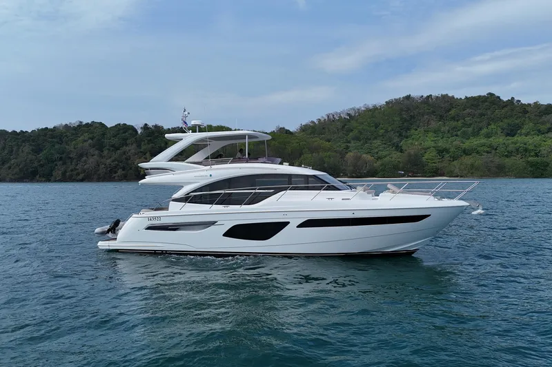 Built by Princess Yachts, LARIEL (18m/57’) reflects the shipyard’s pedigree for performance and intelligent design. Her GRP hull delivers confident, stable cruising, while her expansive flybridge and teak-laid cockpit create seamless indoor-outdoor flow.