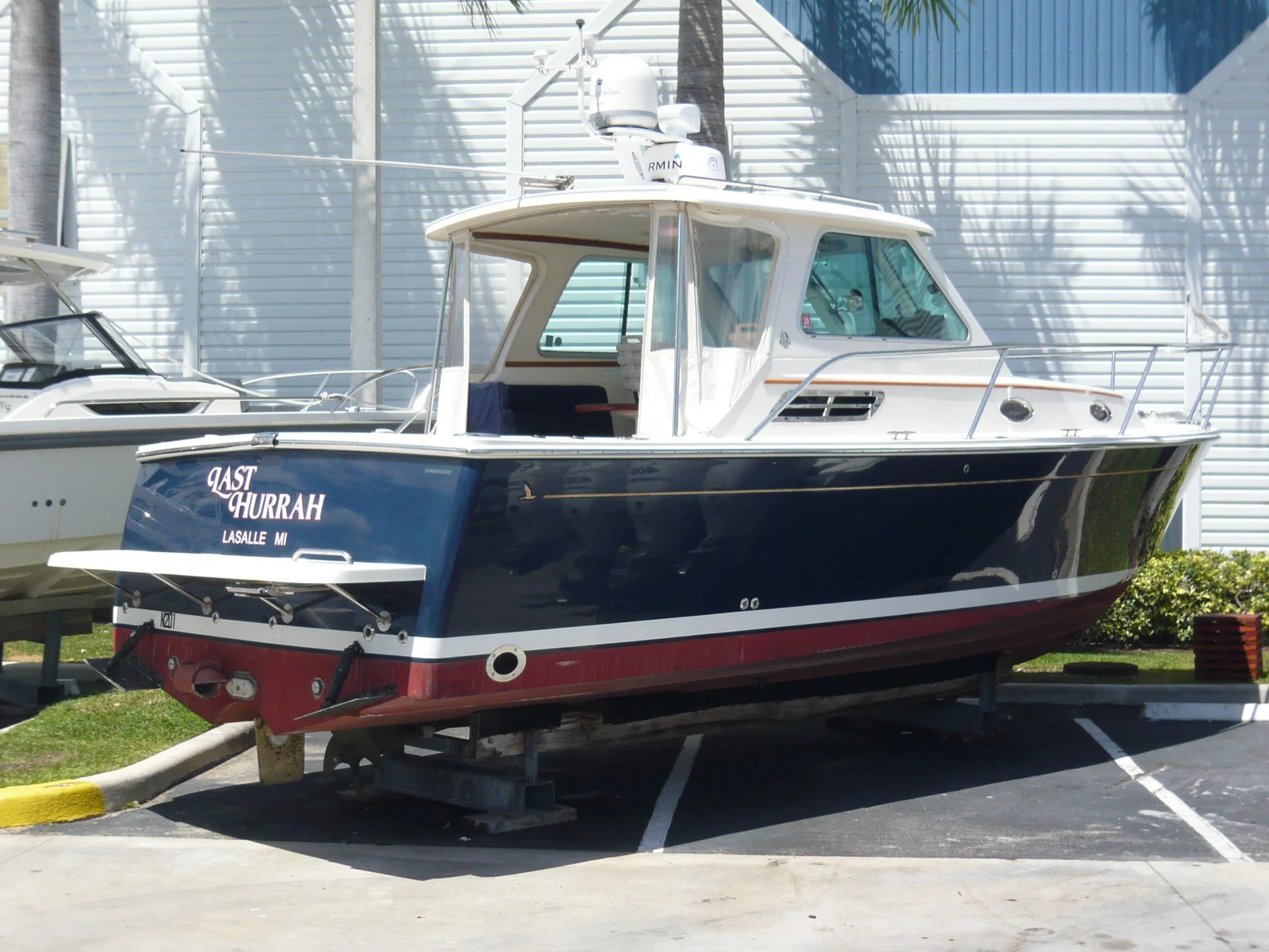 Step aboard and discover a warm, well-appointed interior featuring a forward V-berth stateroom, a full head with pull-out shower nozzle, air conditioning and a beautiful cherry wood interior with teak and holly sole. The galley is fully equipped with Corian countertops, microwave, refrigerator, stove, and plenty of storage. Above, the spacious helm deck provides excellent visibility and comfort, complemented by Garmin electronics, bow and stern thrusters, a 2nd helm deck air-conditioning system, and a removable cockpit bench for versatile entertaining or fishing setups. This vessel has been meticulously maintained and stored indoors, making her a rare find for those seeking a stylish, capable cruiser.