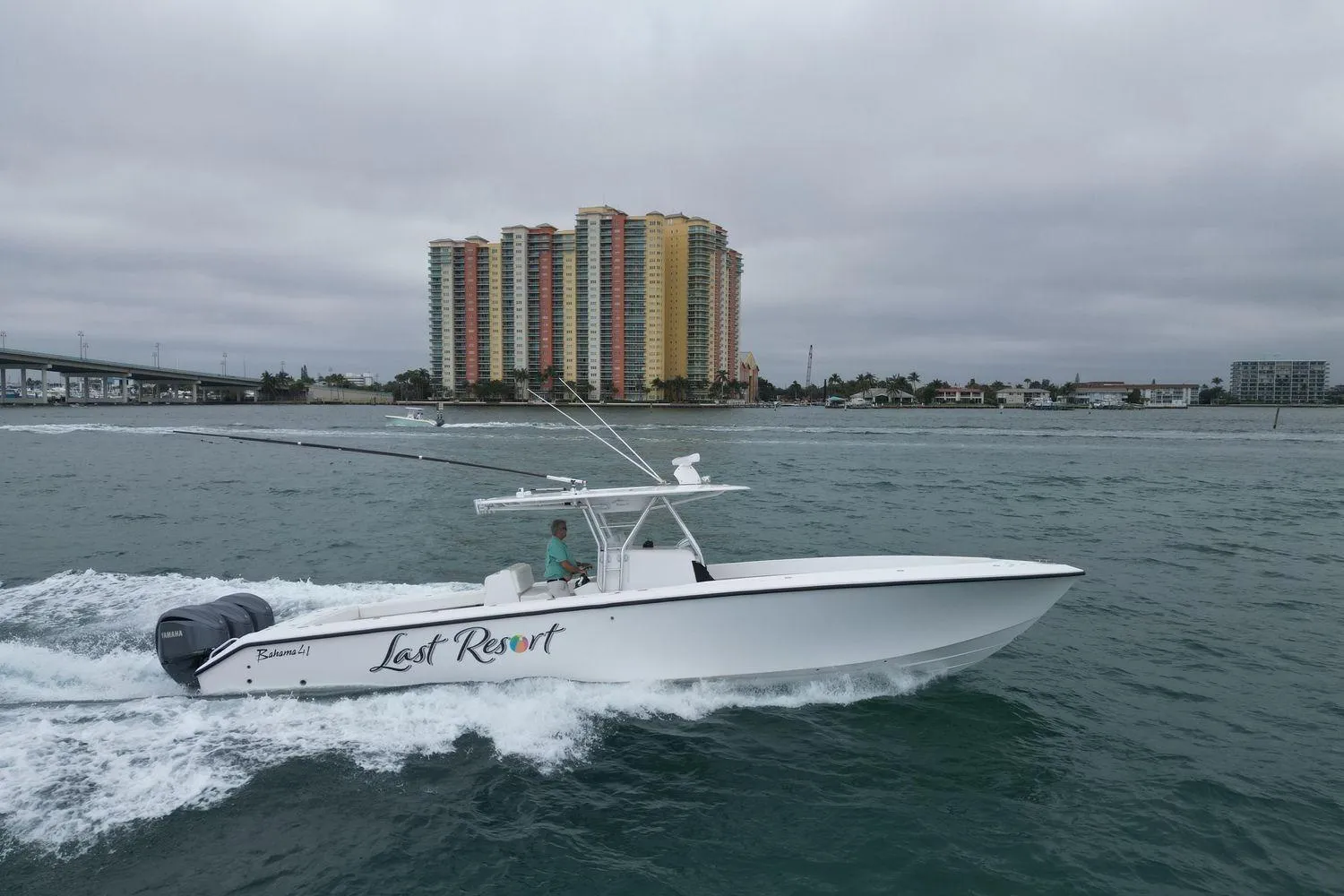 LAST RESORT is a 2013 Bahama 41 - Raised Deck with triple Yamaha 300hp (repowered in 2022) Only 415 hrs and engine warranty until March 2026!!!