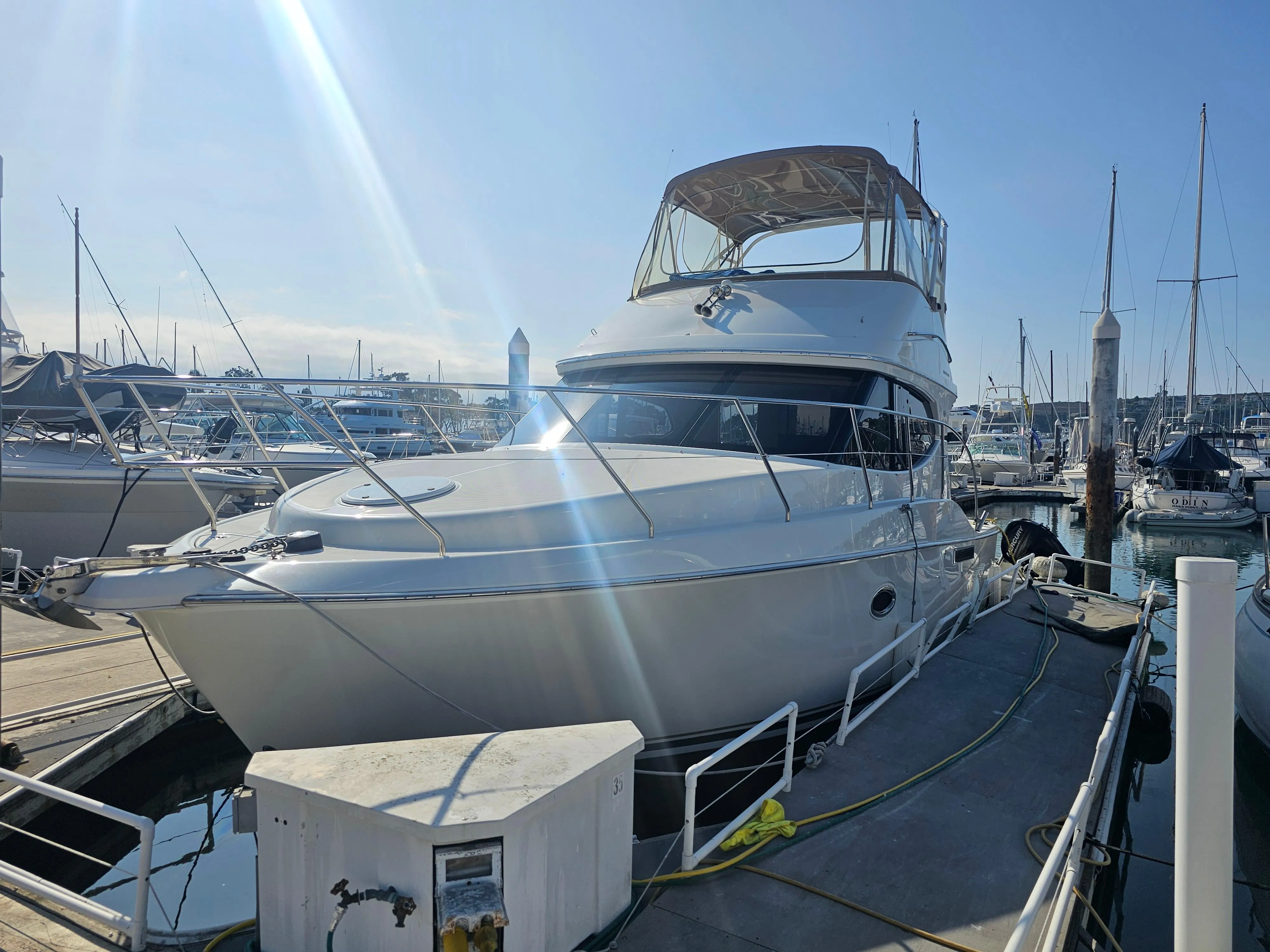 Welcome aboard Latitude 33! She's a beautiful 2007 Silverton 33 Convertible with twin 375HP fresh water cooled Crusader 6.0 MPI direct drive inboards. On top of that, they have just 400 hours on them!! The cabin has 2 full Staterooms and a up galley layout with plenty of room for family & friends . Key features include a new full bridge enclosure , 5 KW Kohler Generator , Heat & Air and much more including a fresh exterior detail .Shown by appointment in Dana Point . Feel free to call us for a personal showing.