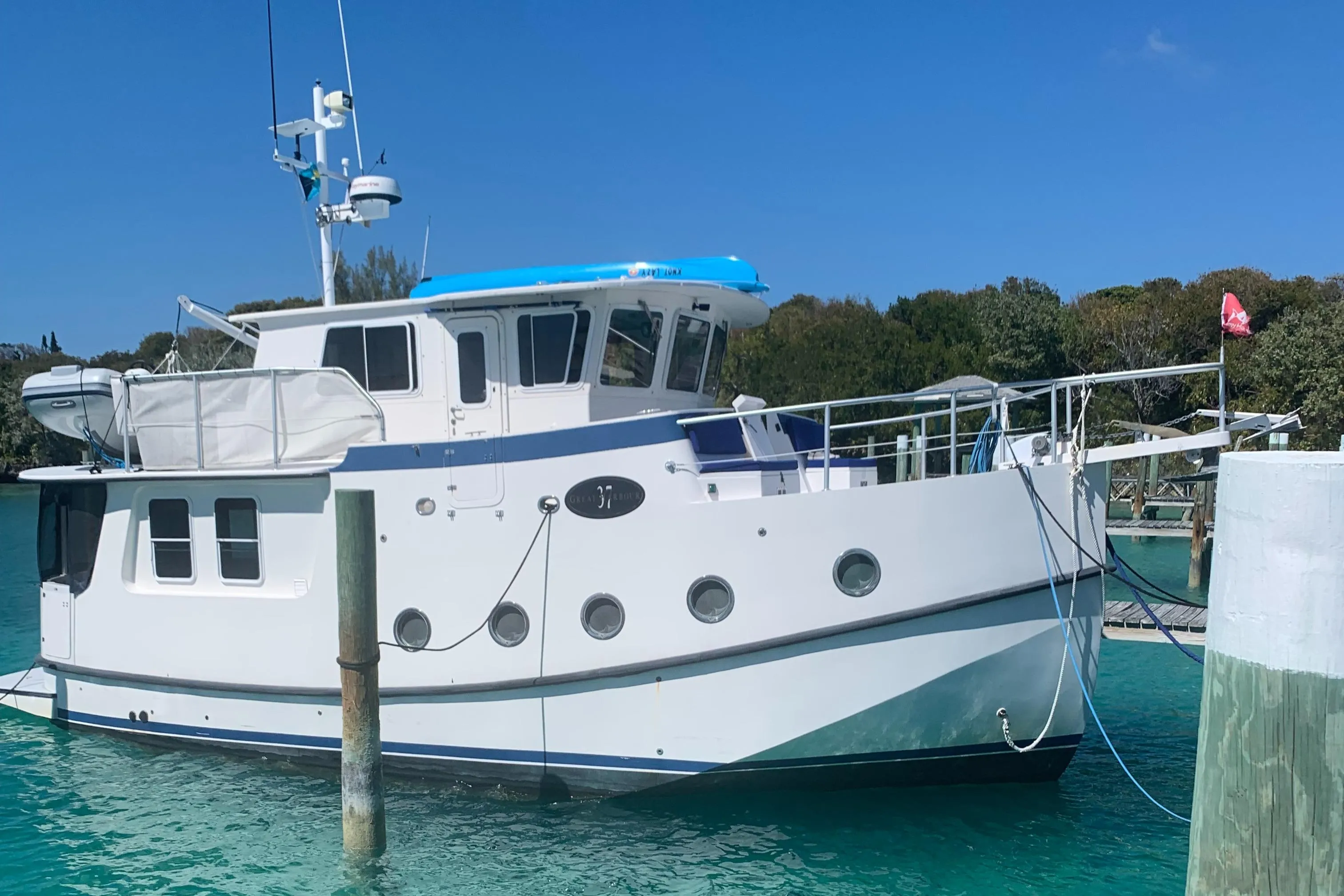 This is the legendary Great Harbour GH37 trawler - without a doubt, the finest liveaboard trawler you can buy under 70' in length. The 16 foot beam and wide-body design give you a volume inside that makes each room feel like home. The space and features will astound you. A full-size galley with home appliances, Two large heads, large, easily accessible engine room with TWIN fuel-efficient Yanmar diesels, master stateroom with true queen-size island berth and a pilothouse that is unequaled in boats this size.