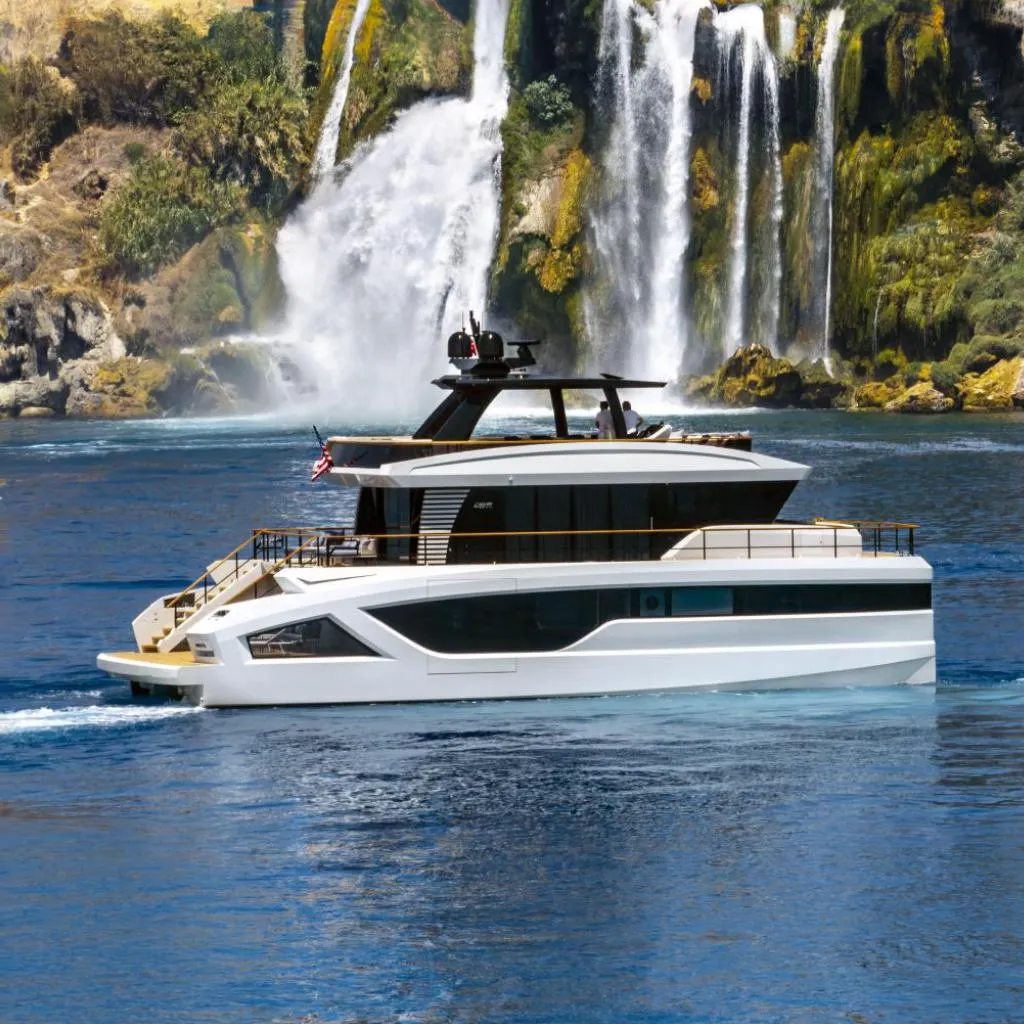 At the heart of this groundbreaking layout is a full-beam master stateroom with a private fold-out balcony—a feature usually reserved for superyachts. Complementing this is a full-beam galley with a butler’s pantry and dinette, offering residential-scale functionality in a sleek, ocean-ready format.