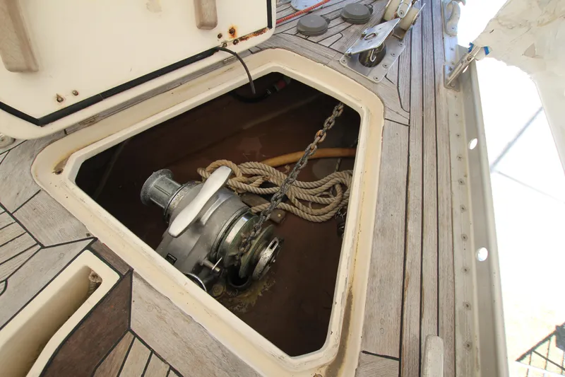 Anchor locker accessed from deck hatch.