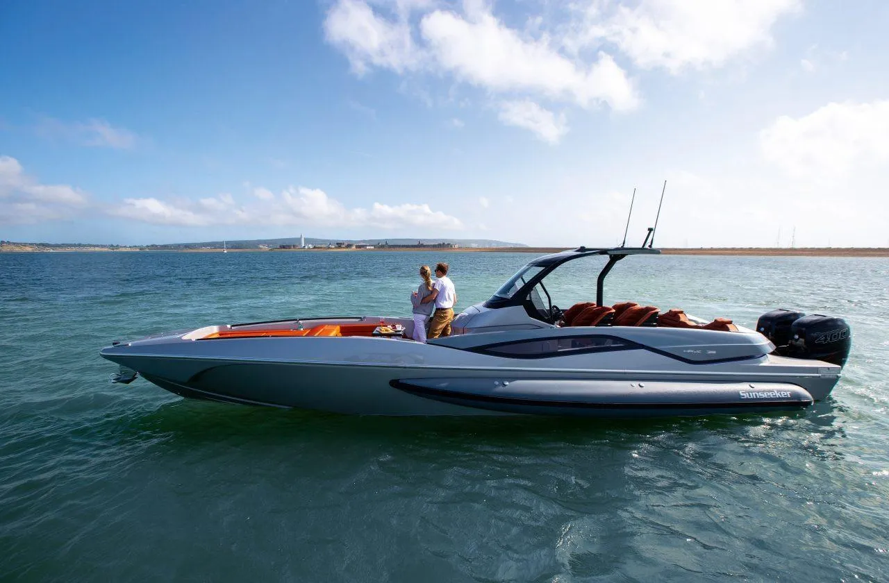 Drawing on the Sunseeker racing heritage, the high-performance Sunseeker Hawk 38  capable of up to 62 knots with the twin Mercury 400R outboards and Mercury Racing Digital Zero Effort throttles.