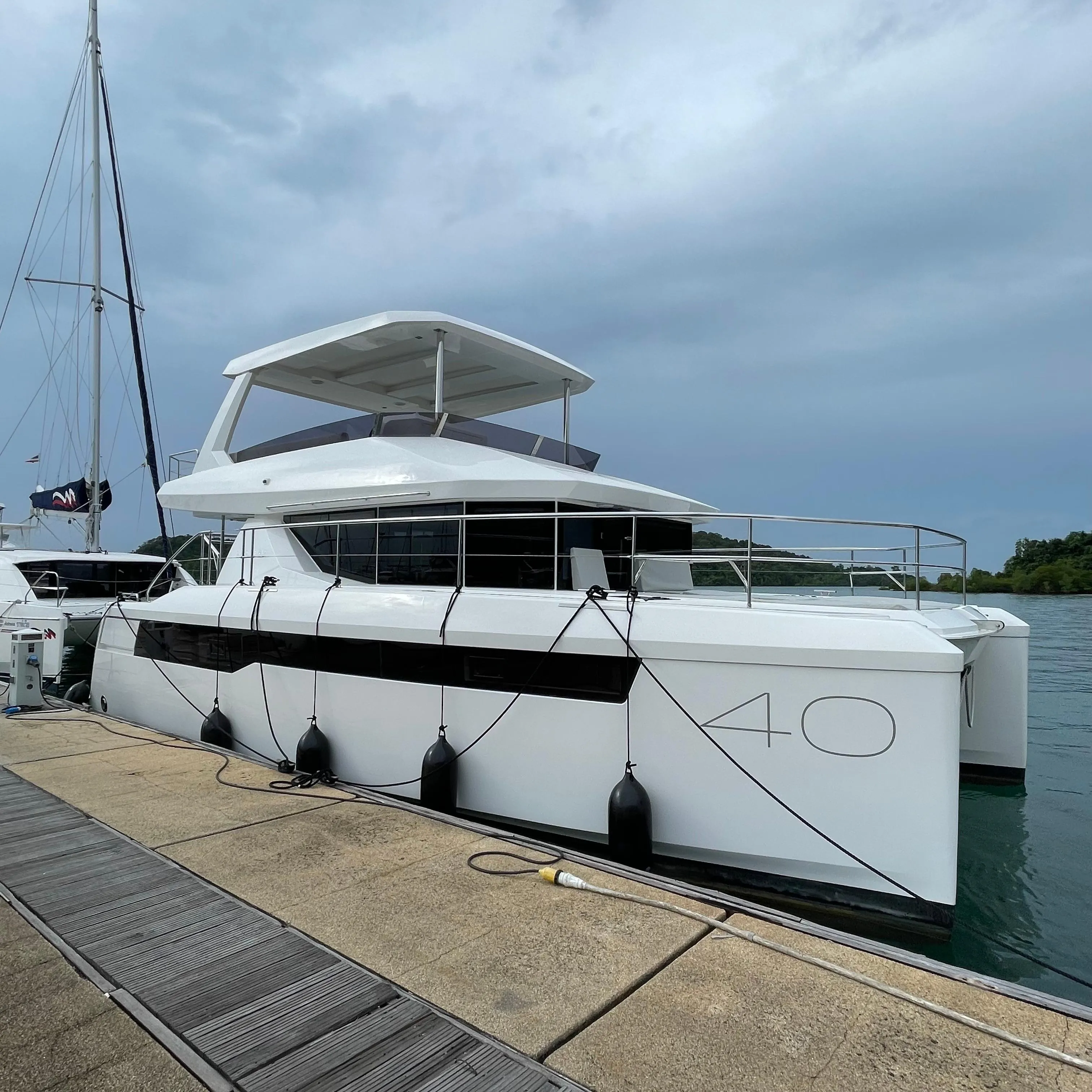 Introducing the stunning Leopard 40PC, a new power catamaran from Leopard Catamarans, designed for those who seek adventure on the water. With an overall length of 12.19 meters, this vessel boasts a sleek composite hull that enhances both performance and aesthetics. Powered by 2 robust Yanmar 8LV-370 engine, delivering 370 hp, the Leopard 40PC achieves a cruising speed of 15 knots and a maximum hull speed of 23 knots, ensuring exhilarating journeys across the waves. Its impressive range of 350 nautical miles at cruising speed allows for extended exploration. Accommodating three cabins and two heads, this catamaran is perfect for family outings or entertaining friends. The inclusion of joystick control and an electric windlass enhances ease of handling, making every voyage a pleasure. Experience the perfect blend of comfort, speed, and innovative design with the Leopard 40PC, where every detail is crafted for an unforgettable maritime adventure.