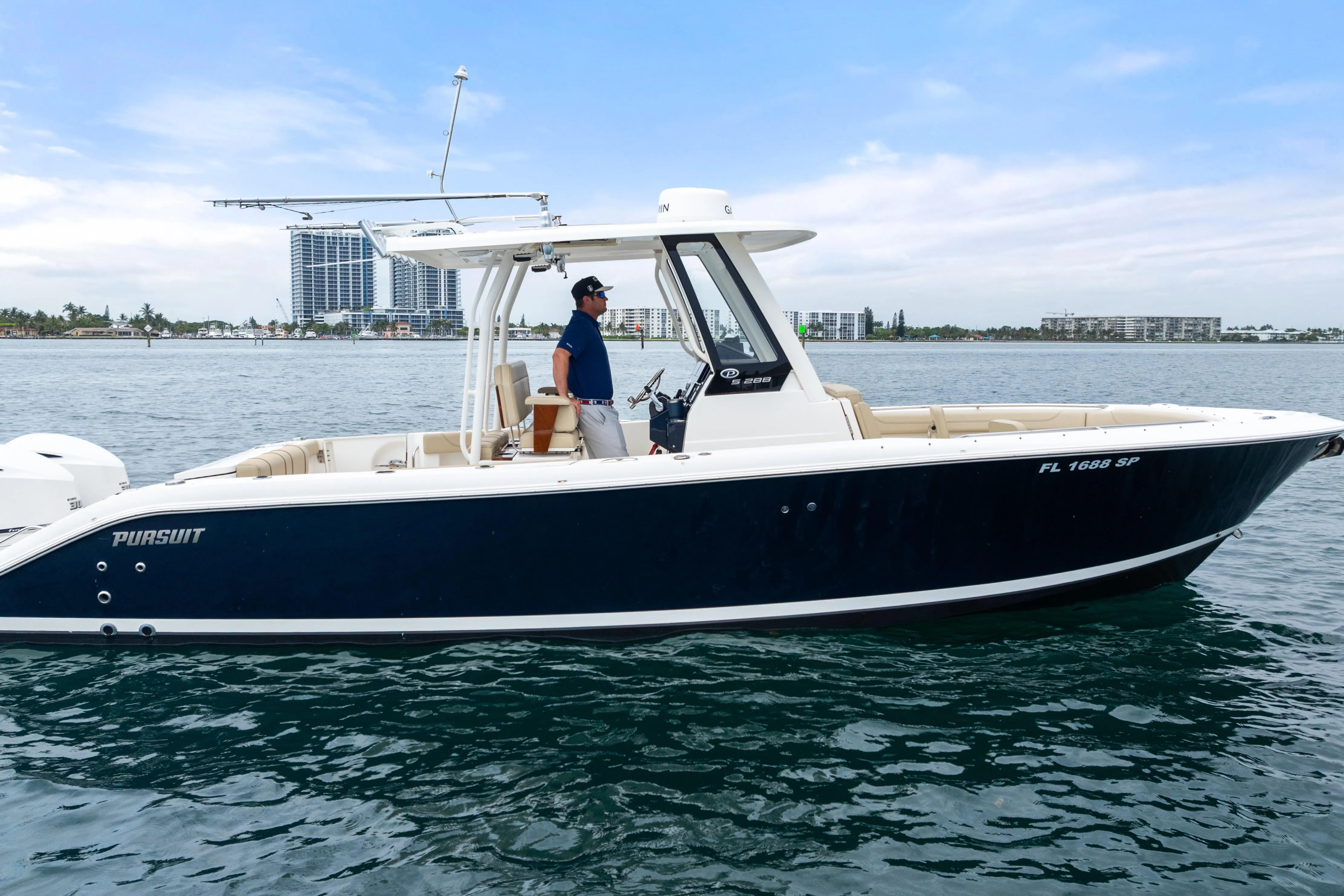 Her versatile layout features forward console and bow seating, teak-accented helm chairs, a fold-down cockpit bench, and a portside dive door for effortless water access. Whether cruising to the Bahamas, enjoying sunset runs, or relaxing at the sandbar, this Pursuit is equipped for it all.